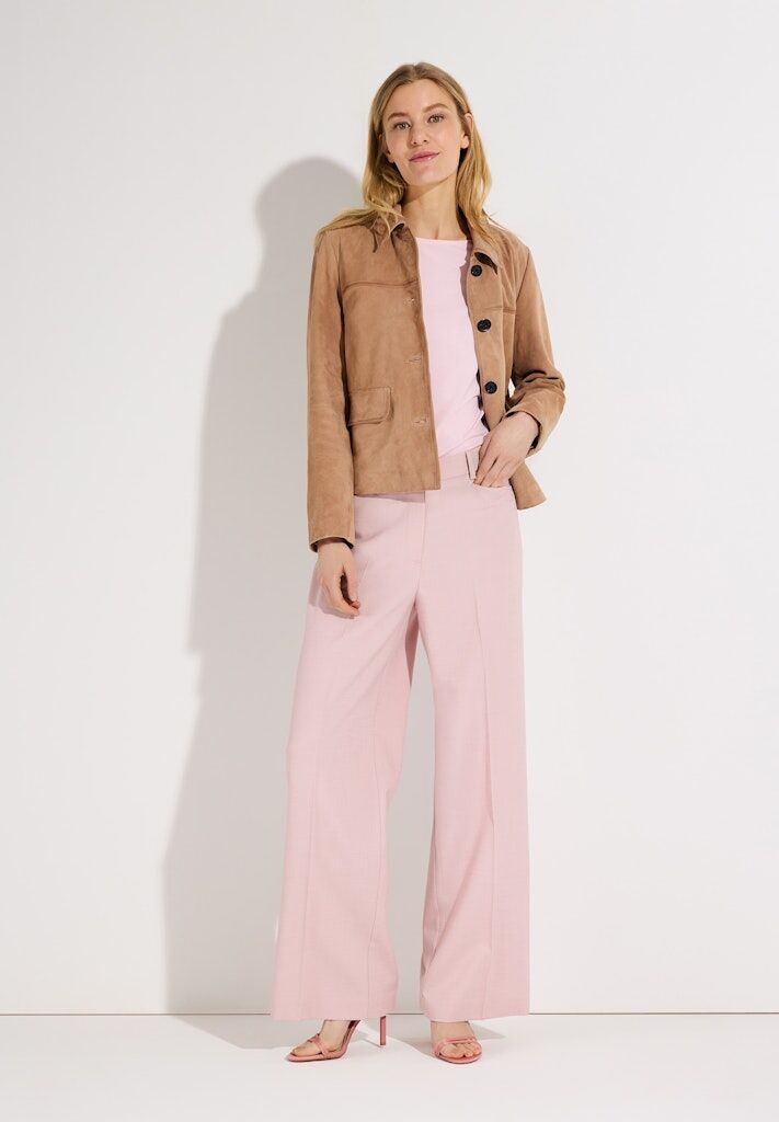 Die moderne Anzughose von MORE & MORE mit weitem Bein und Bügelfalte verkörpert zeitlose Klasse und sorgt für einen eleganten, hochwertigen Look. Die weite Silhouette bietet ein angenehmes Tragegefühl, während der zarte Rosaton der klassischen Hose eine feminine Note verleiht. Ob im Office mit passendem Blazerjäckchen, beim Dinner mit Chiffontop und Heels oder aber lässig mit T-Shirt und Jeansjacke - die gepflegte Anzughose ist ein vielseitiges Key-Piece für selbstbewusste Looks mit Stil.