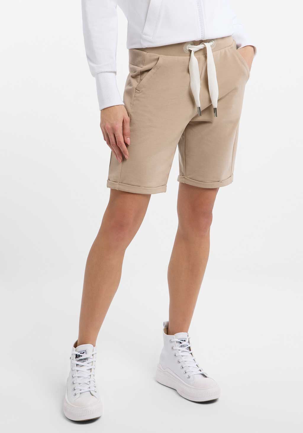 Die Bermuda-Shorts "Brinjana" von ELBSAND vereinen sportiven Stil mit maximalem Komfort. In einem frischen Beige gehalten, bringt sie Leichtigkeit in deine Sommergarderobe. Das weiche, elastische Material und der bequeme Bund mit Kordelzug sorgen für eine optimale Passform, während praktische Details und ein dezenter Logoprint den lässigen Look perfekt abrunden.