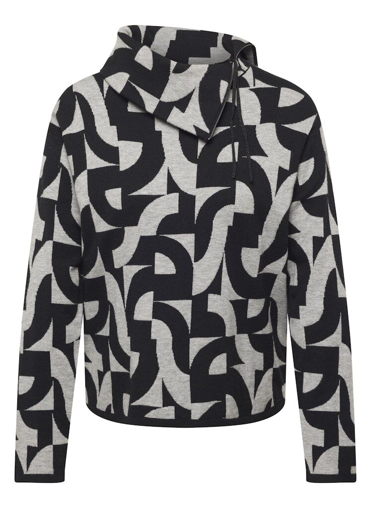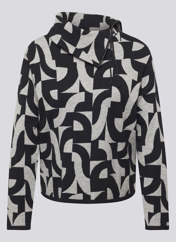 Dieser modische Pullover setzt mit seinem kontrastreichen Allover-Muster ein klares Statement. Der weich strukturierte Materialmix mit hohem Viskoseanteil sorgt für ein angenehmes Tragegefühl und bleibt gleichzeitig formstabil. Der legere Schnitt wird durch den hohen Kragen mit Tunnelzug ergänzt, der für eine sportive Optik sorgt. Gedeckte Farben machen das Modell vielseitig kombinierbar. Tunnelkragen mit Zugband. Weich strukturierte Qualität. Grafisches Allover-Motiv. Lässige Passform mit langem Arm. Formstabiler Viskose-Mix.