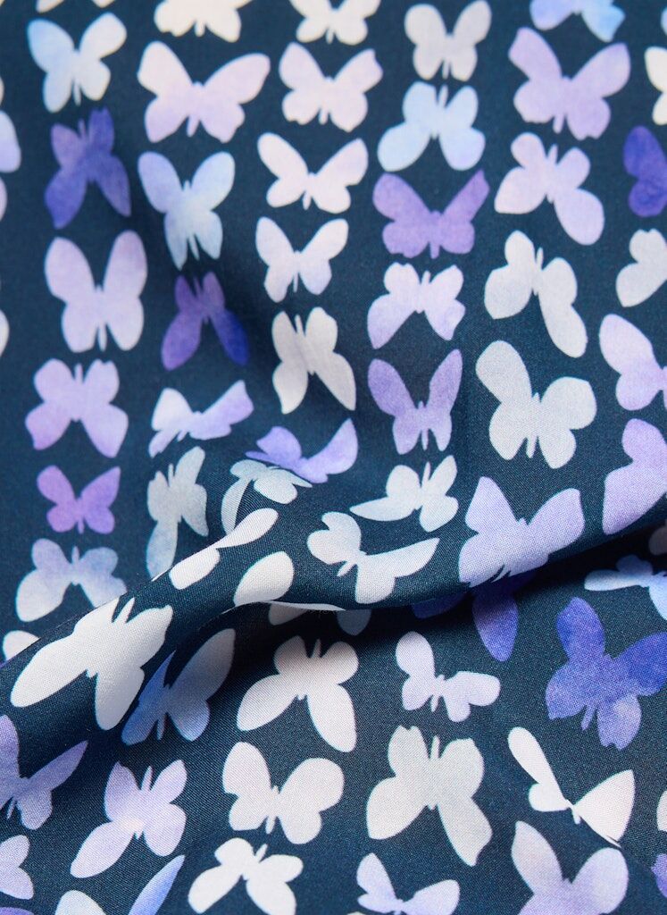 Diese Bluse begeistert mit einem dekorativen Allover-Muster in gedeckten Violett- und Blautönen. Der feminine V-Ausschnitt und die sanft gerafften 3/4-Ärmel unterstreichen die legere Passform. Die weich fließende Qualität sorgt für ein angenehmes Tragegefühl und macht das Modell zum idealen Begleiter für stilvolle Freizeit-Looks. Gedeckte Farben im Schmetterlingsdesign. 3/4-Ärmel mit leichten Raffungen. 3/4-Ärmel mit leichten Raffungen.