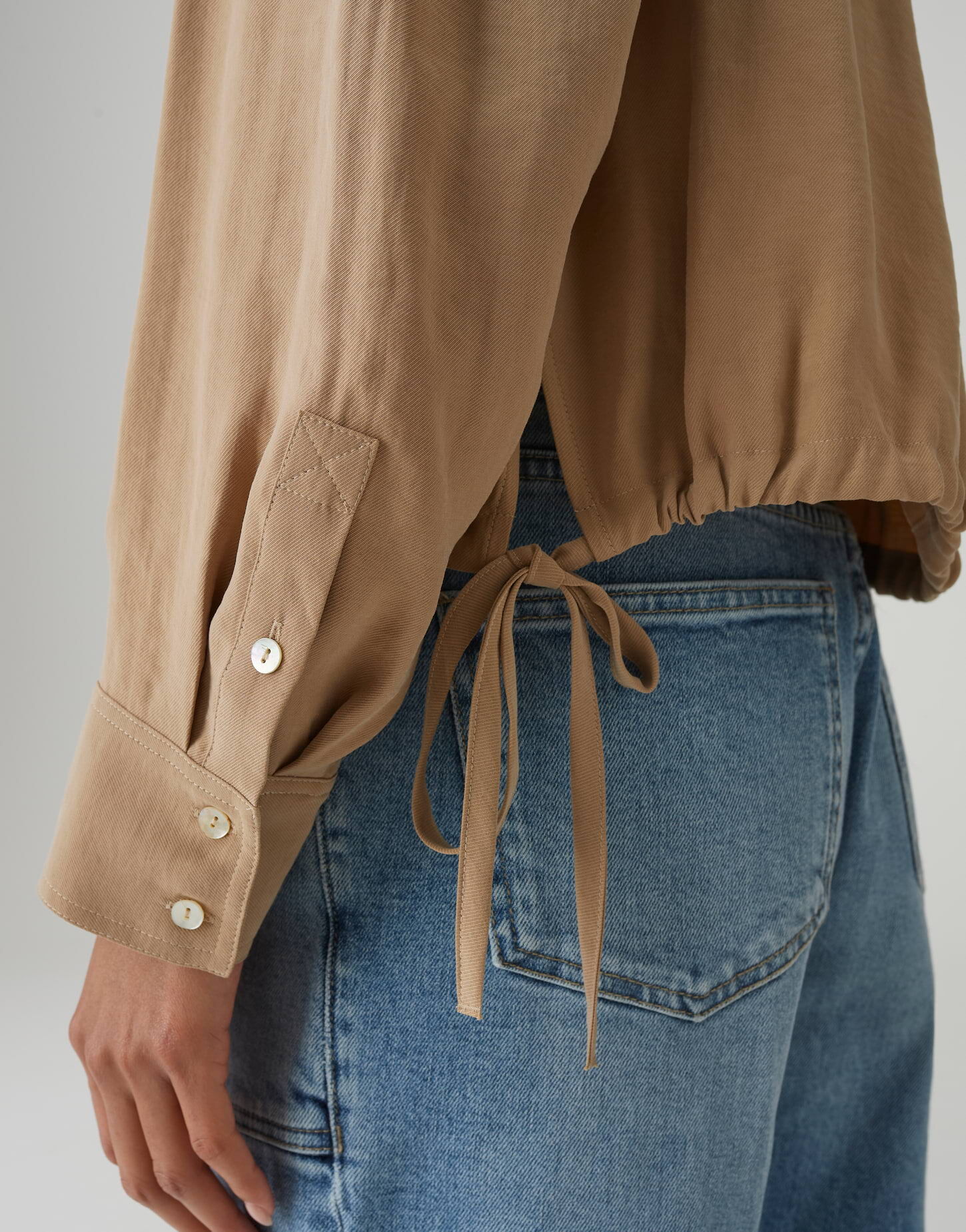 - Details: Tunnelzug mit Bindebändern am Saum, aufgesetzte Brusttaschen, durchgehende Knopfleiste, breite Manschetten mit Knöpfen, Rückenpasse mit Kellerfalte