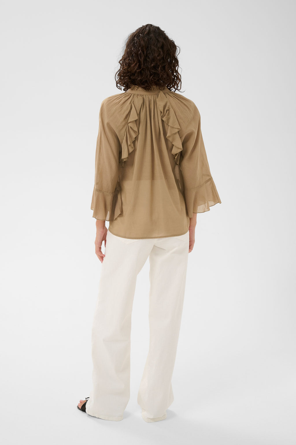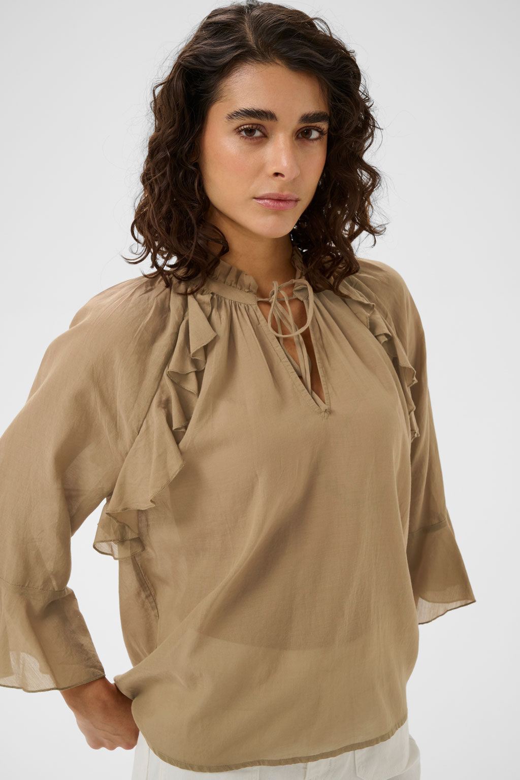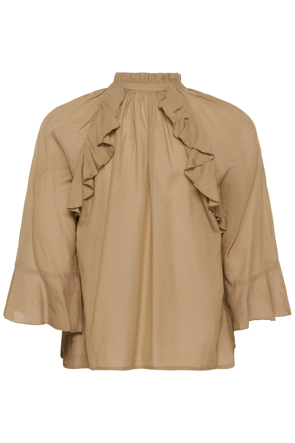 Bluse mit lockerem Schnitt, Rundhalsausschnitt und Bindeband. Rüschen ziehen sich über Vorderseite und Ärmel. Dreiviertelärmel weit geschnitten.