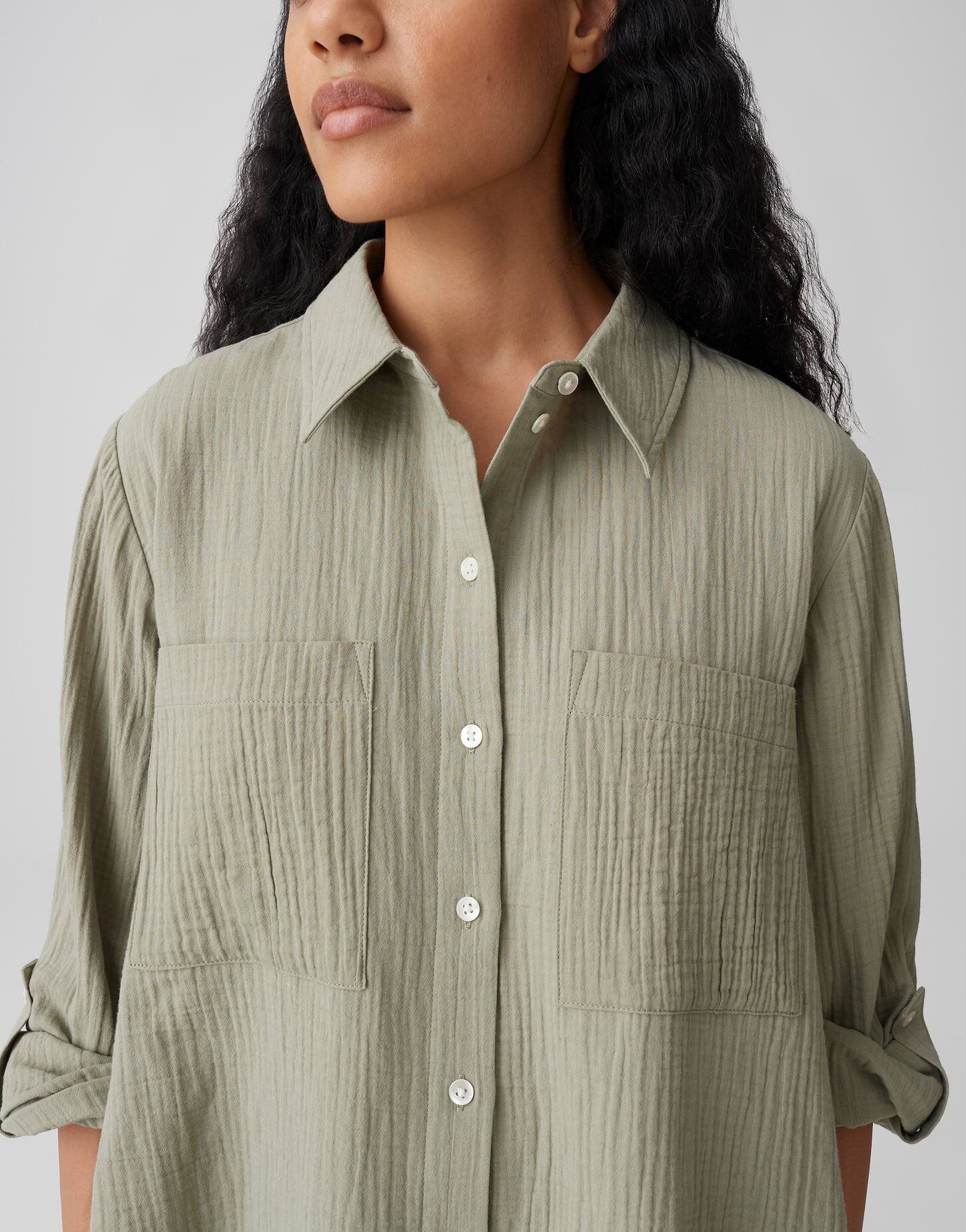 Die Opus Bluse "Fralea" in Pale Olive überzeugt mit einer lässigen Silhouette und einer modernen, natürlichen Ausstrahlung. Der leichte Crinkle-Stoff sorgt für eine strukturierte Optik und einen angenehm weichen Griff, während der fließende Fall der Bluse eine entspannte Eleganz verleiht. Die weite Passform mit leicht ausgestelltem Schnitt unterstreicht den lockeren Look. Klassische Elemente wie der Hemdblusenkragen, die durchgehende Knopfleiste mit Perlmuttknöpfen sowie aufgesetzte Brusttaschen runden das Design stilvoll ab. Dank der praktischen Ärmelriegel lässt sich die Bluse flexibel stylen, ideal für vielseitige, modische Alltagslooks.