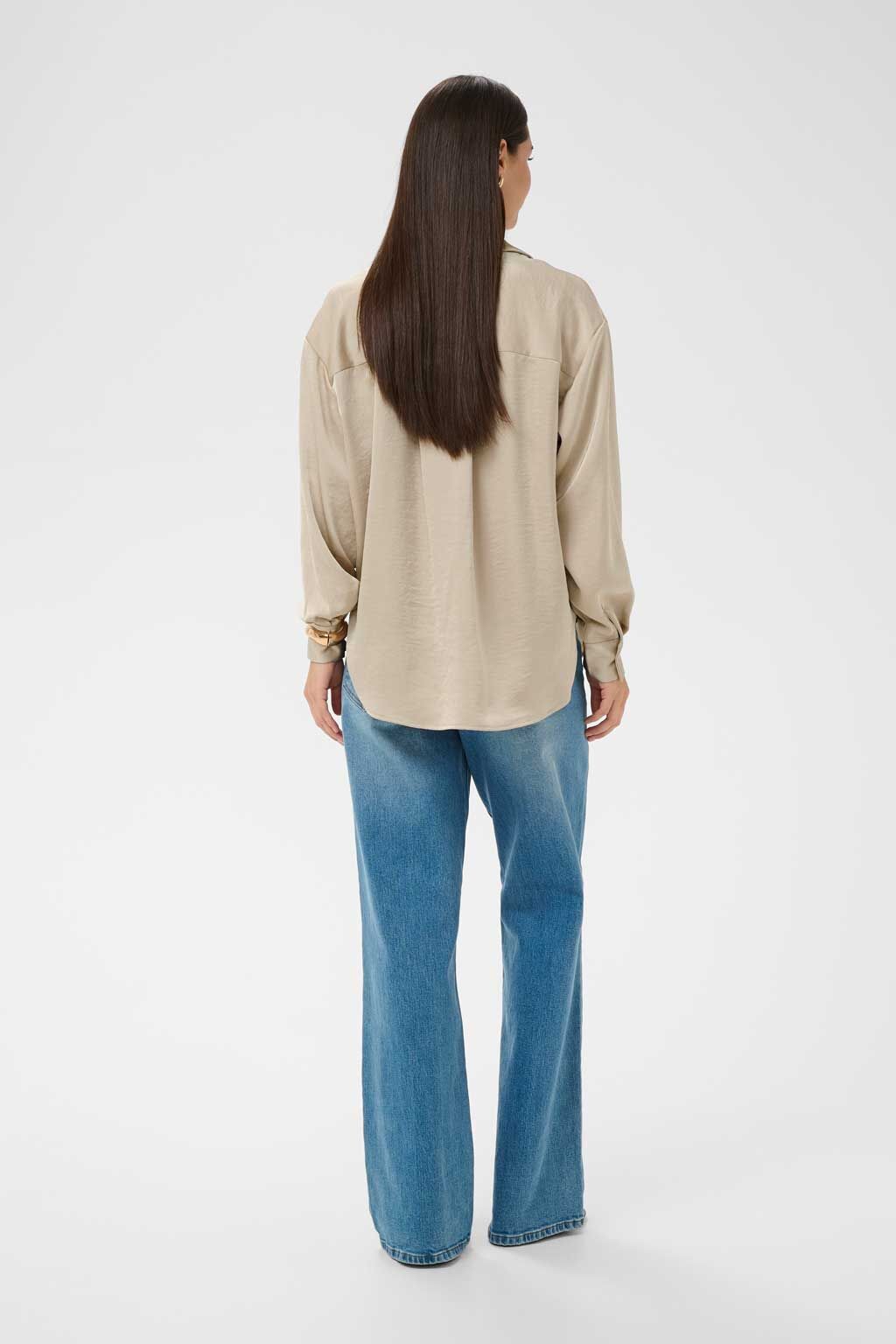 Die Kaffe Bluse "Rory" in der Farbe Feather Gray überzeugt mit einer eleganten, fließenden Optik und modernem Minimalismus. Das leicht schimmernde Material verleiht der Bluse eine edle Ausstrahlung, während der lockere Schnitt für angenehmen Tragekomfort sorgt. Der klassische Hemdkragen und die durchgehende Knopfleiste unterstreichen den zeitlosen Charakter des Designs. Ob im Büro, zu besonderen Anlässen oder lässig kombiniert - diese Bluse ist ein vielseitiger Begleiter für stilvolle Looks.