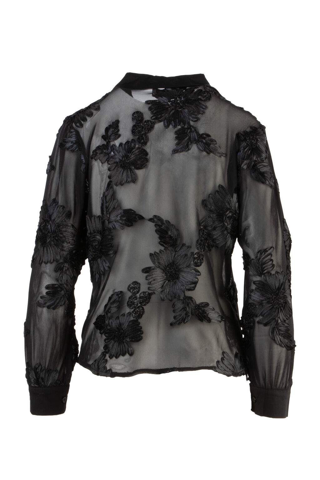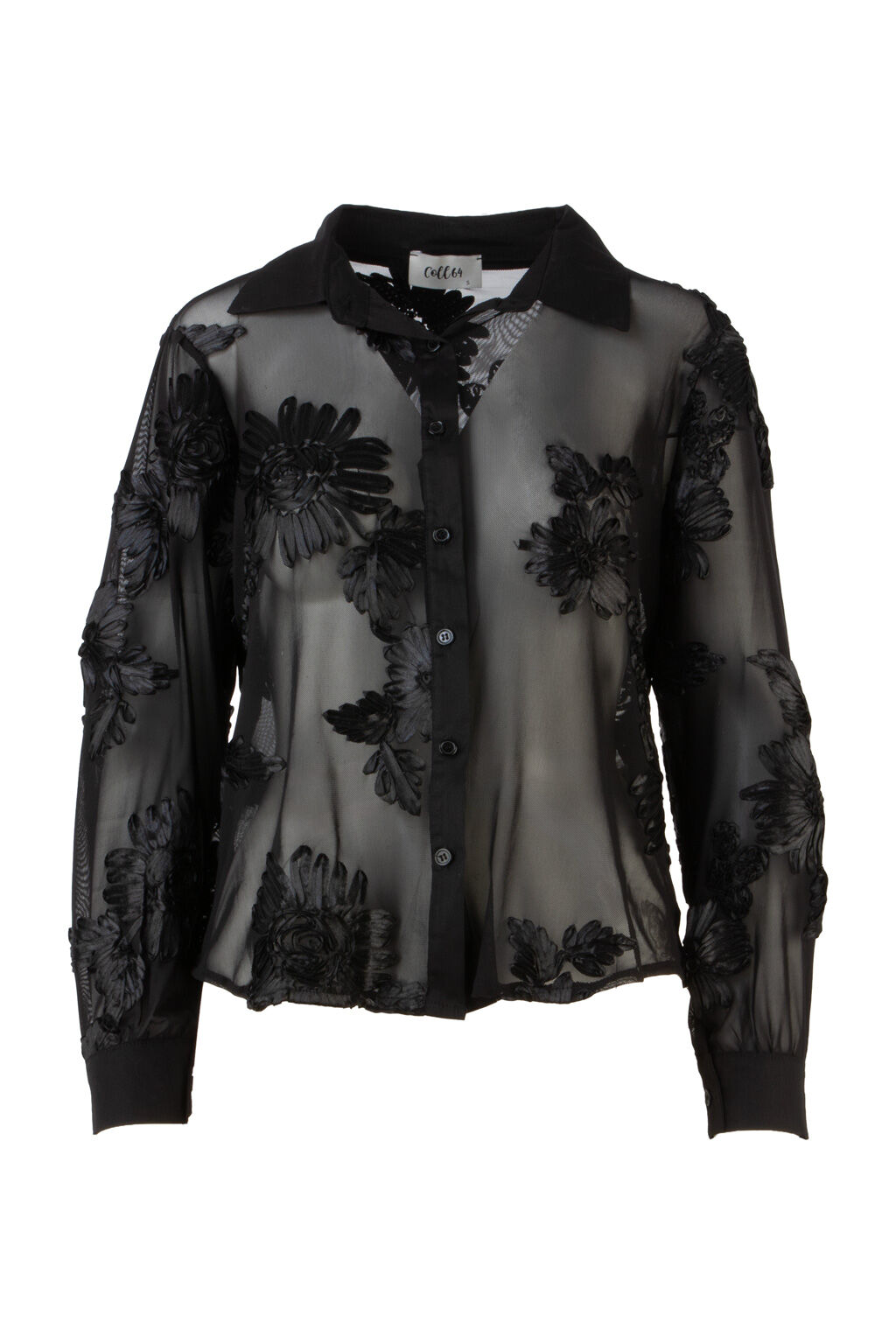 - Details: Durchgehende Knopfleiste, aufgenähte 3D-Blüten, transparente Optik, feine Bündchen an den Ärmeln