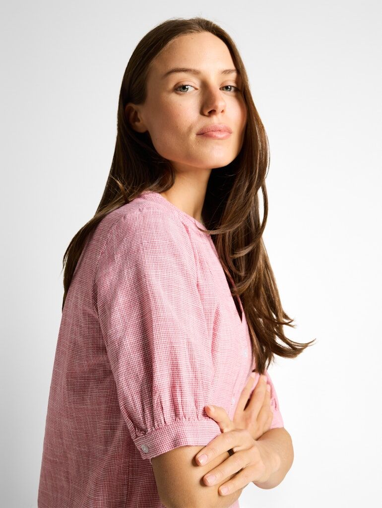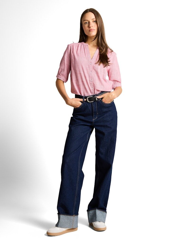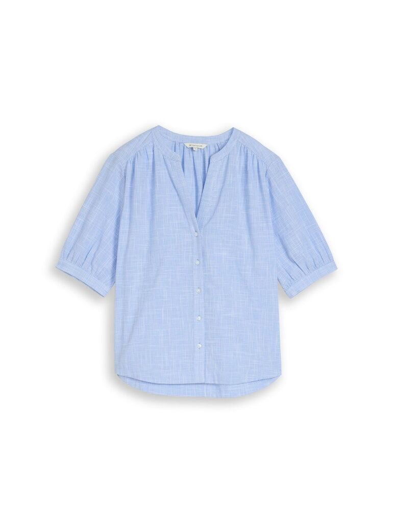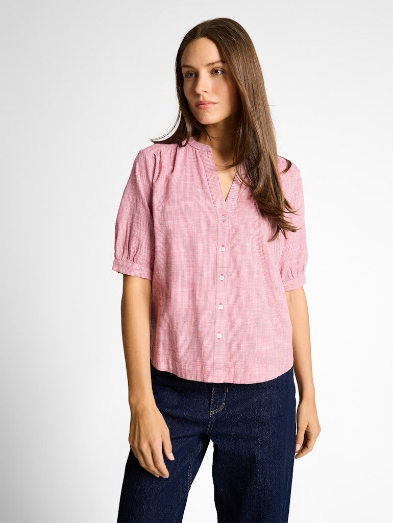 Bluse mit V-Ausschnitt und Knopfleiste. Mit Raffungen an den Schultern und an den Ärmeln. Aus einem leicht strukturierten Baumwollstoff.