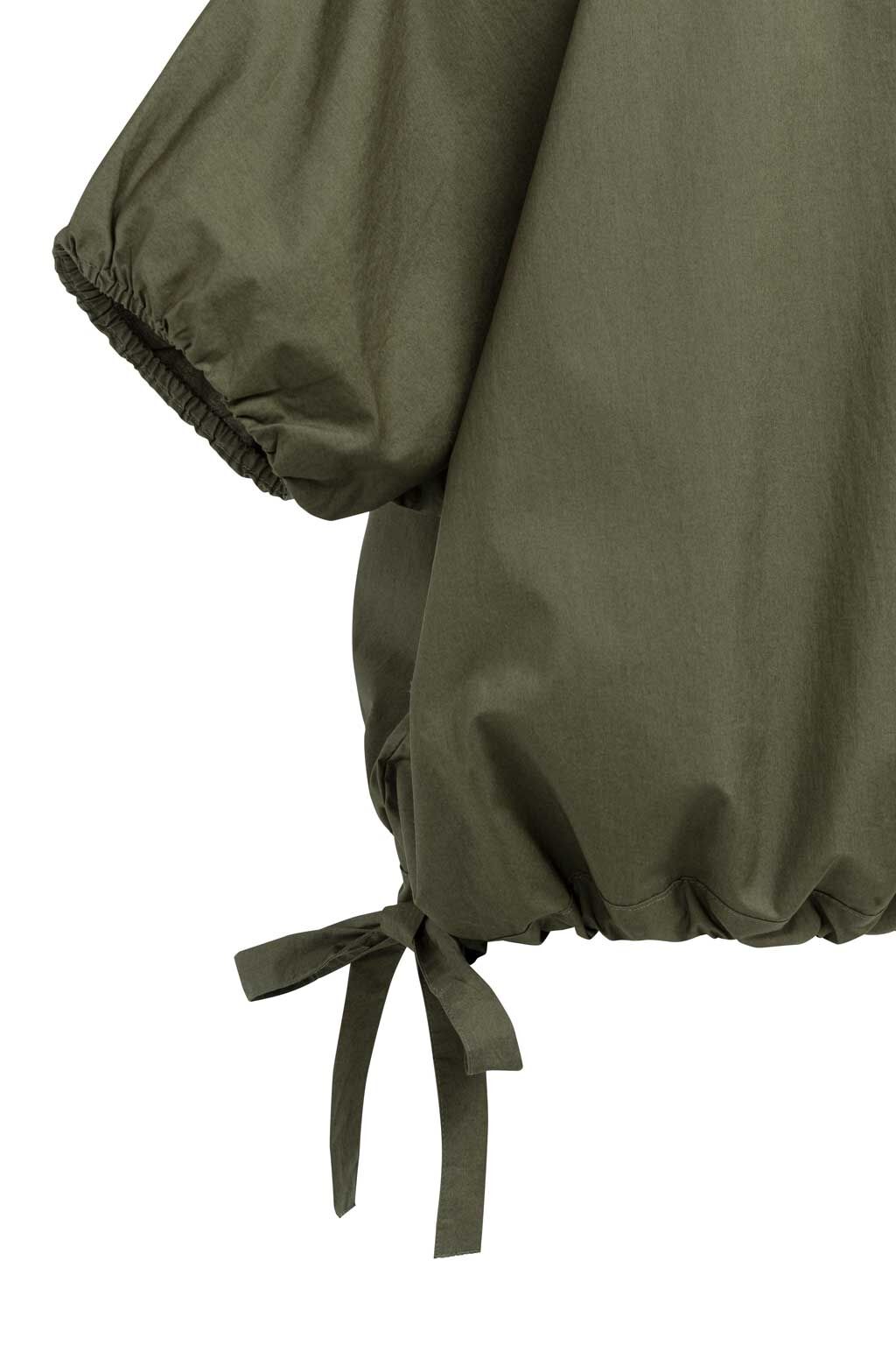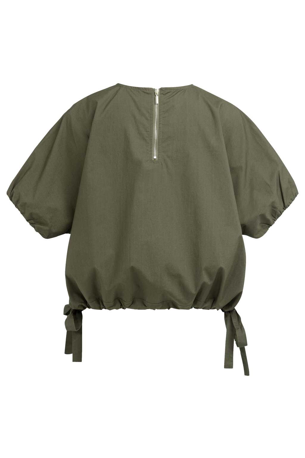 - Details: Elastischer Saum, seitliche Bindebänder, voluminöse Ärmel, Knopfverschluss im Nacken, moderne Silhouette