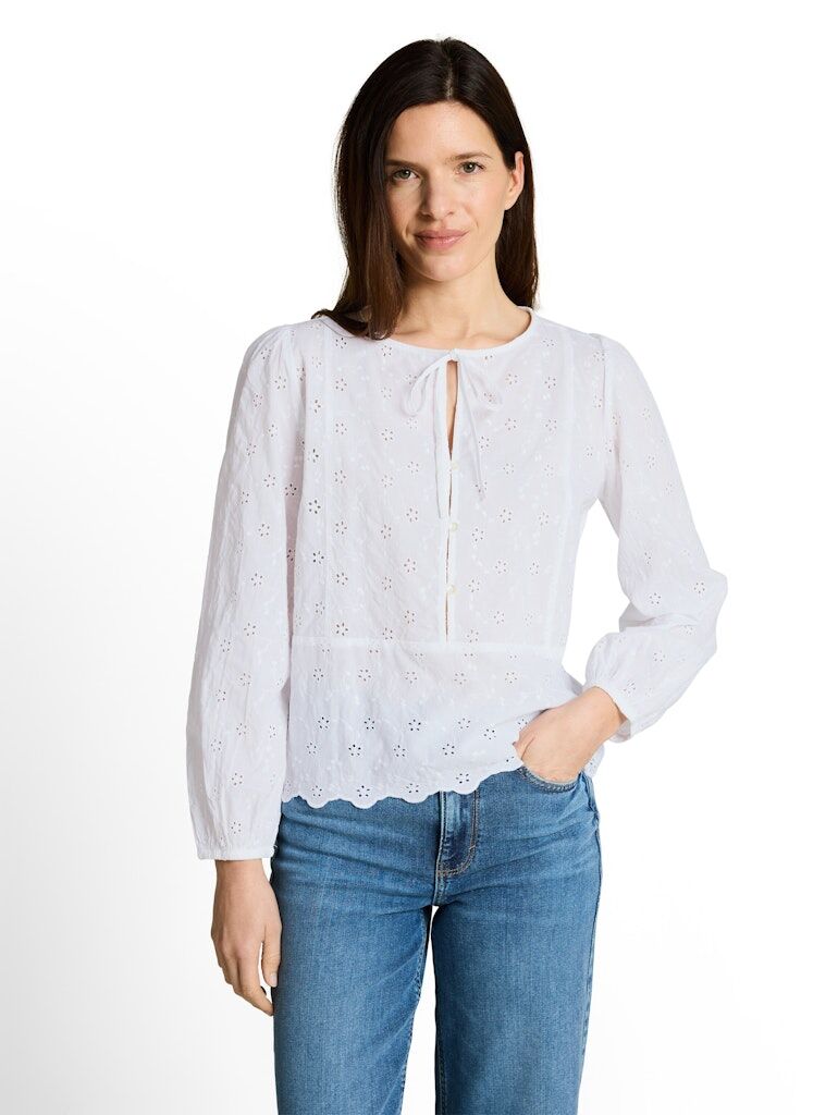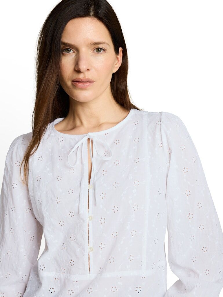 Feminine Langarm-Bluse mit halber Knopfleiste und Binde-Detail am Kragen. Mit einem elastischen Band in den Ärmelabschlüssen für eine geraffte Optik. Mit einem gestickten Muschelsaum. Aus einem Gewebe aus Baumwolle mit Lochstickereien.