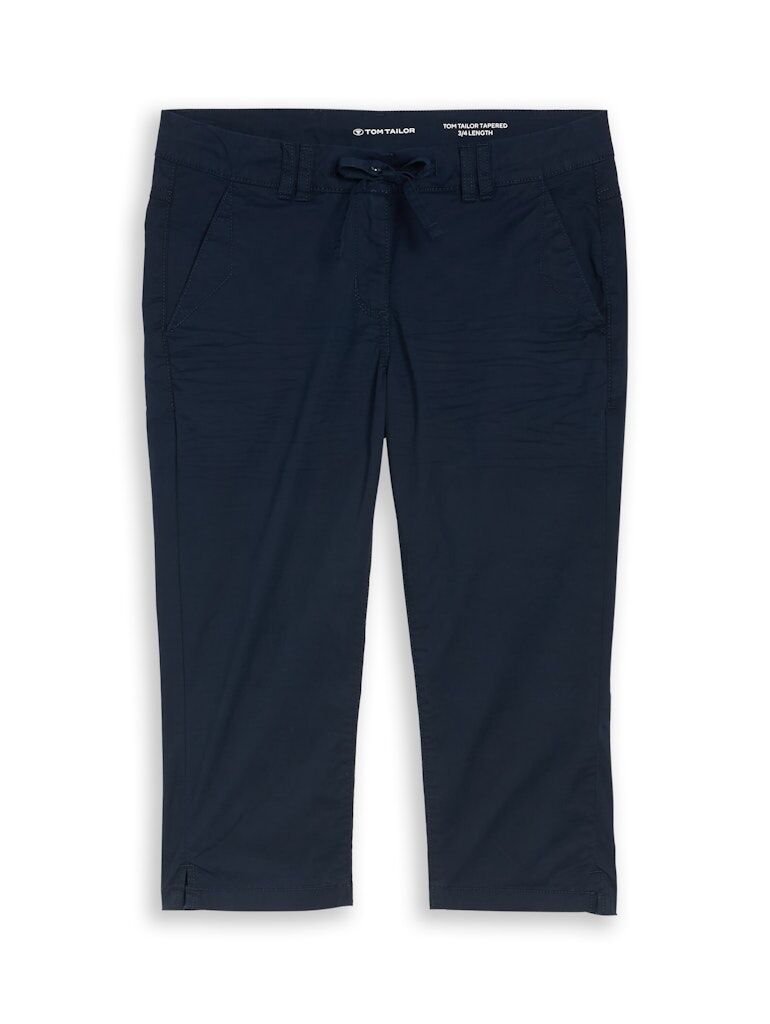 Capri Hose mit Kordelzug im Bund. Mit seitlichen Eingriffstaschen vorne und aufgesetzten Taschen hinten. Aus einem leichten, gewebten Baumwollstoff.