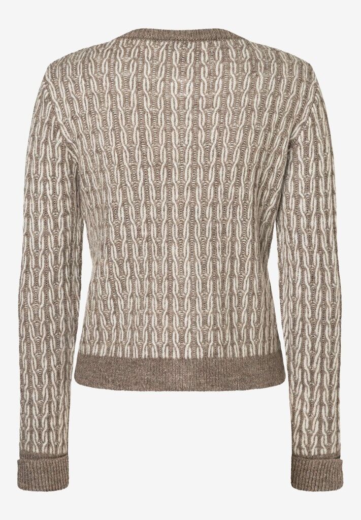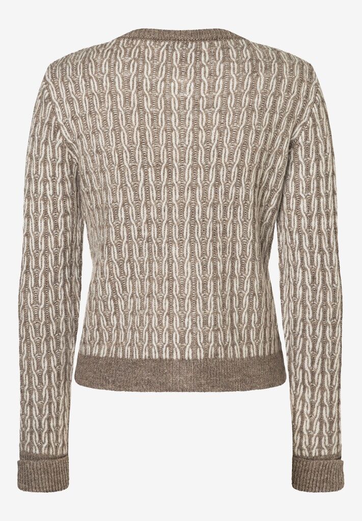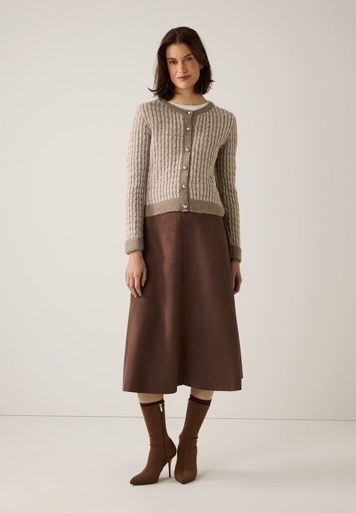 Die zweifarbig gemusterte Strickjacke in taupe/ecru von MORE & MORE mit silberfarbenen Kugelknöpfen sieht zur weiten Marlenehose, lässigen Jeans oder zum fließenden Satinrock gleichermaßen gut aus.