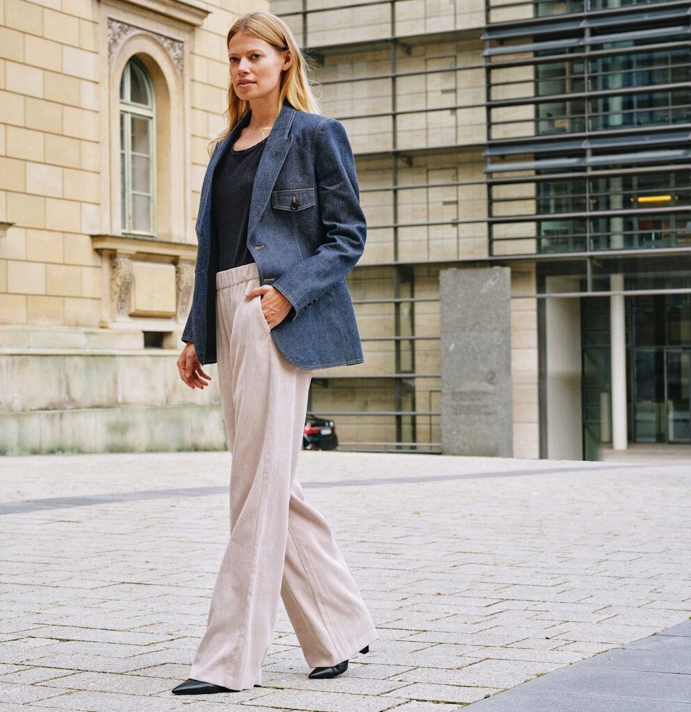 Wide Fit, Wide Leg, weites, gerades Bein, mittlere Leibhöhe, bequemer, elastischer Bund, Jump In-Modell, seitliche Eingrifftaschen vorne, Paspeltaschen hinten, Fluid Corduroy, hochwertiger, elastischer Breitcord, sehr weicher Griff, leichte, fließende Qualität, edler Glanz und Farbbrillanz, aufgeräumte, cleane Optik, hervorragende Passform, hoher Tragekomfort, Das Model ist 1,75m groß und trägt die MAC Hosengröße 36, Fußweite bei Größe 36: 52cm