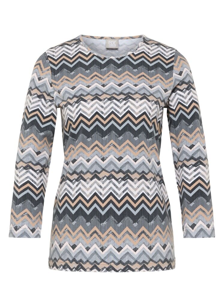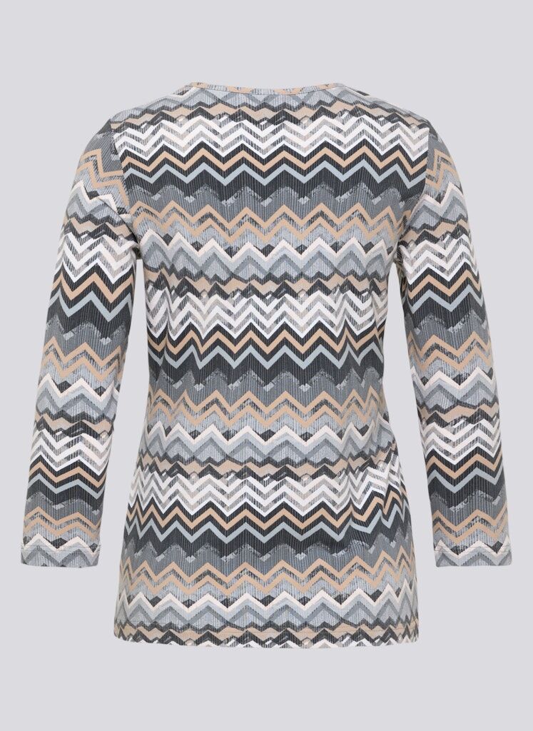 Dieses Shirt ist mit einem modernen Zickzack-Muster gestaltet und sorgt so für einen lebendigen Look. Der Rundhalsausschnitt und die 3/4-Ärmel bieten eine klassische Silhouette, während das weiche Material angenehm auf der Haut liegt. Ideal für Kombinationen mit schlichten Hosen oder Jeans. Bequemer Rundhalsausschnitt. Elastisches, trageangenehmes Material. Ausgefallener Zickzack-Print. 3/4-lange Ärmel. Pflegeleichte Qualität.