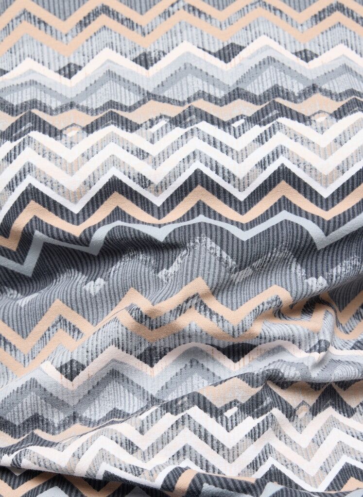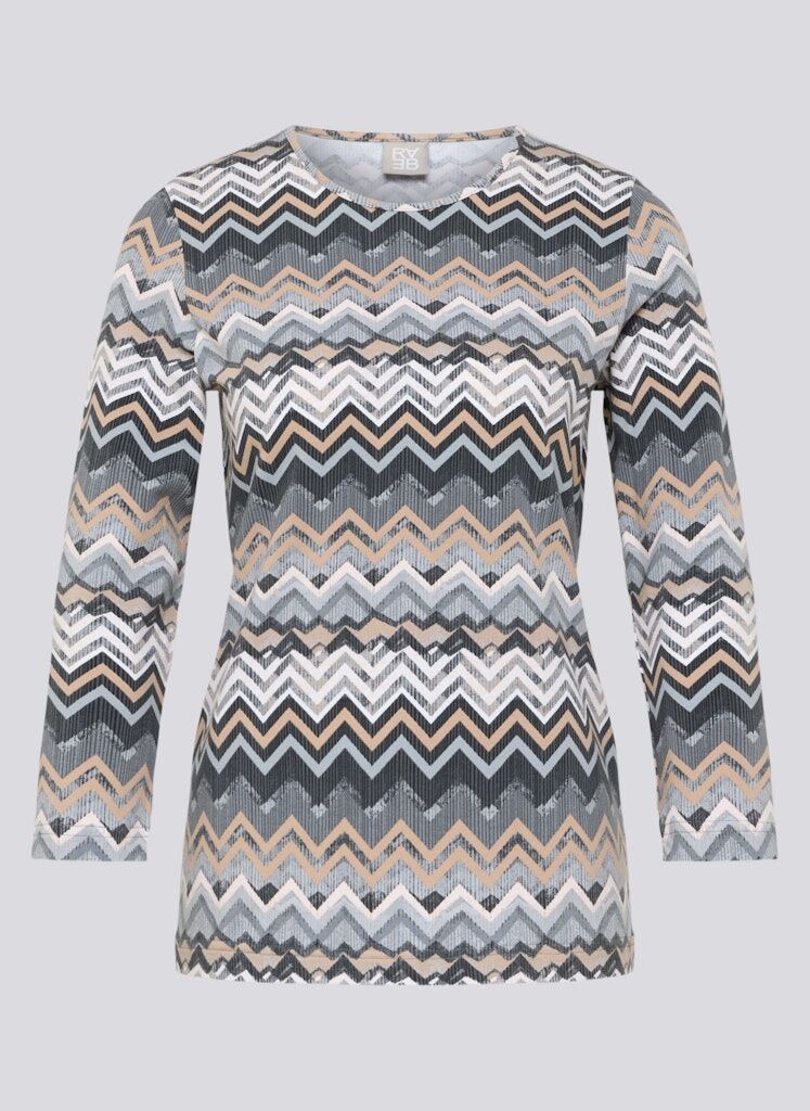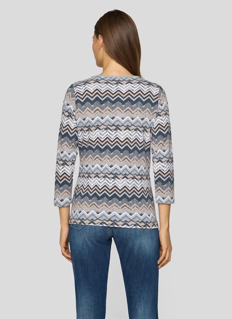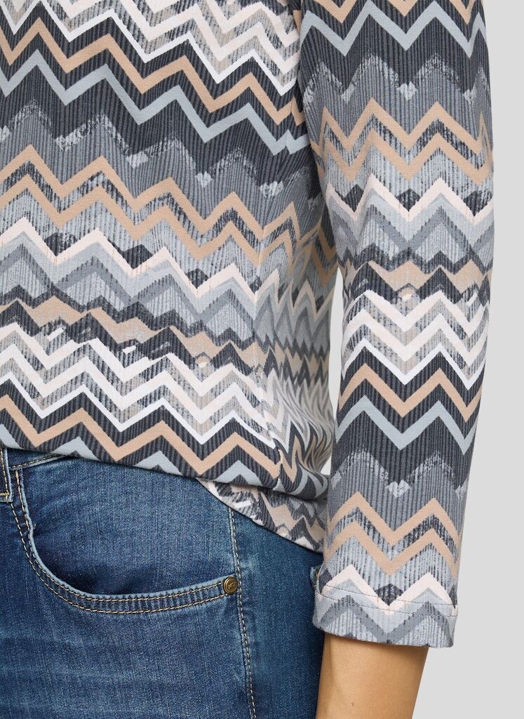 Dieses Shirt ist mit einem modernen Zickzack-Muster gestaltet und sorgt so für einen lebendigen Look. Der Rundhalsausschnitt und die 3/4-Ärmel bieten eine klassische Silhouette, während das weiche Material angenehm auf der Haut liegt. Ideal für Kombinationen mit schlichten Hosen oder Jeans. Bequemer Rundhalsausschnitt. Elastisches, trageangenehmes Material. Ausgefallener Zickzack-Print. 3/4-lange Ärmel. Pflegeleichte Qualität.