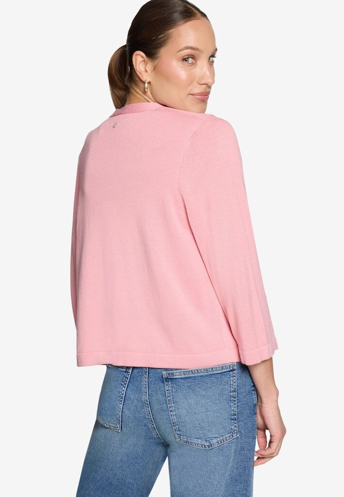 Die zero Strickjacke in Bridal Rose ist ein zeitloses Basic mit femininer Ausstrahlung. Der weiche, feine Strick sorgt für ein angenehmes Tragegefühl, während die offene Form ohne Verschluss eine moderne, unkomplizierte Silhouette schafft. Die verkürzte Länge und die 3/4-Ärmel machen die Strickjacke zu einem idealen Begleiter für leichte Layering-Looks, perfekt über Tops, Blusen oder Shirts. Die zarte Farbnuance verleiht jedem Outfit eine frische, elegante Note. Dieses Strickteil der Marke zero ist perfekt für die kälteren Tage.
