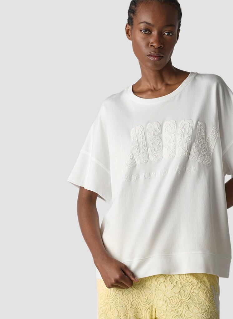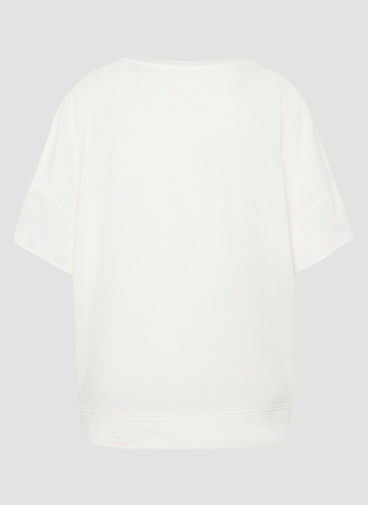 Dieses Shirt verbindet Komfort mit einer besonderen Oberfläche. Der hochwertige Mix aus Baumwolle und Modal fühlt sich weich an, ist atmungsaktiv und fällt fließend. Der weite Schnitt mit überschnittenen Schultern sorgt für eine moderne, entspannte Silhouette, während die strukturierte Applikation auf der Vorderseite einen dezenten Blickfang setzt. Ideal für unkomplizte Alltagslooks mit stilvoller Note. Weicher Baumwoll-Modal-Mix. Lockerer, moderner Schnitt. Überschnittene Schultern. Struktur-Applikation vorne. Angenehm leichtes Tragegefühl.