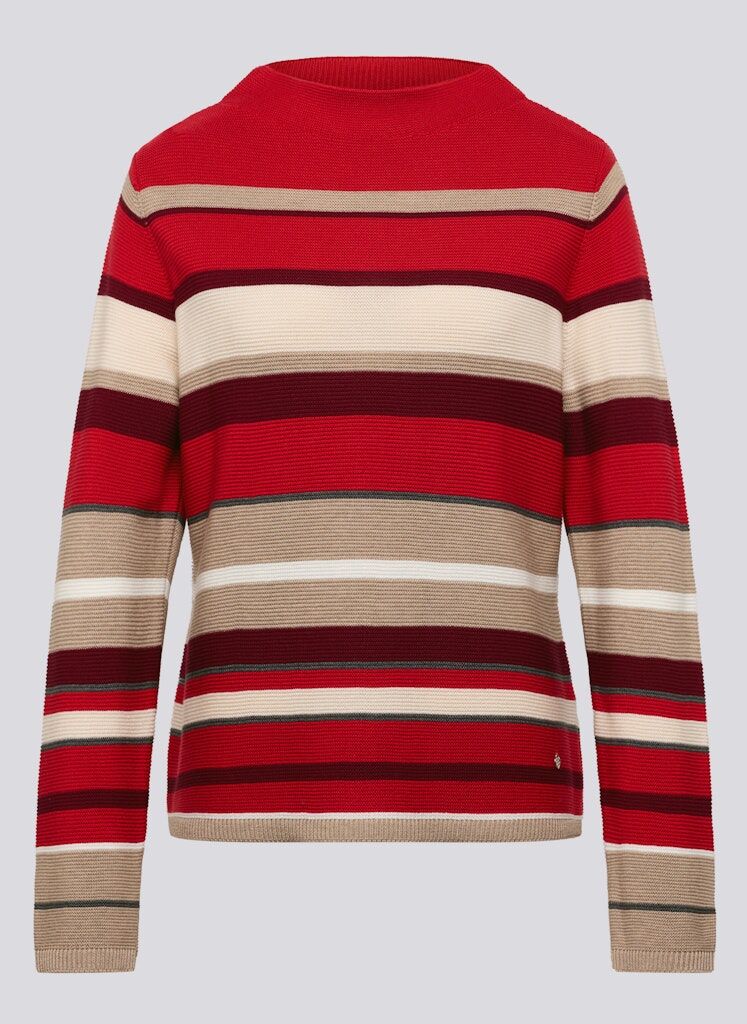 Dieser Pullover bringt mit seinem abwechslungsreichen Streifendesign in warmen Tönen frische Akzente in jede Garderobe. Die strukturierte Strickqualität sorgt für eine angenehme Haptik und hohen Tragekomfort. Der klassische Rundhalsausschnitt und die formstabilen Bündchen runden den Look harmonisch ab. Strukturstrick mit Streifenmuster. Elastische Ärmel- und Saumbündchen. Kleiner Stehkragen.
