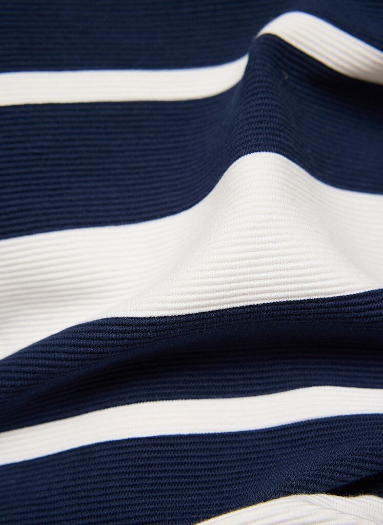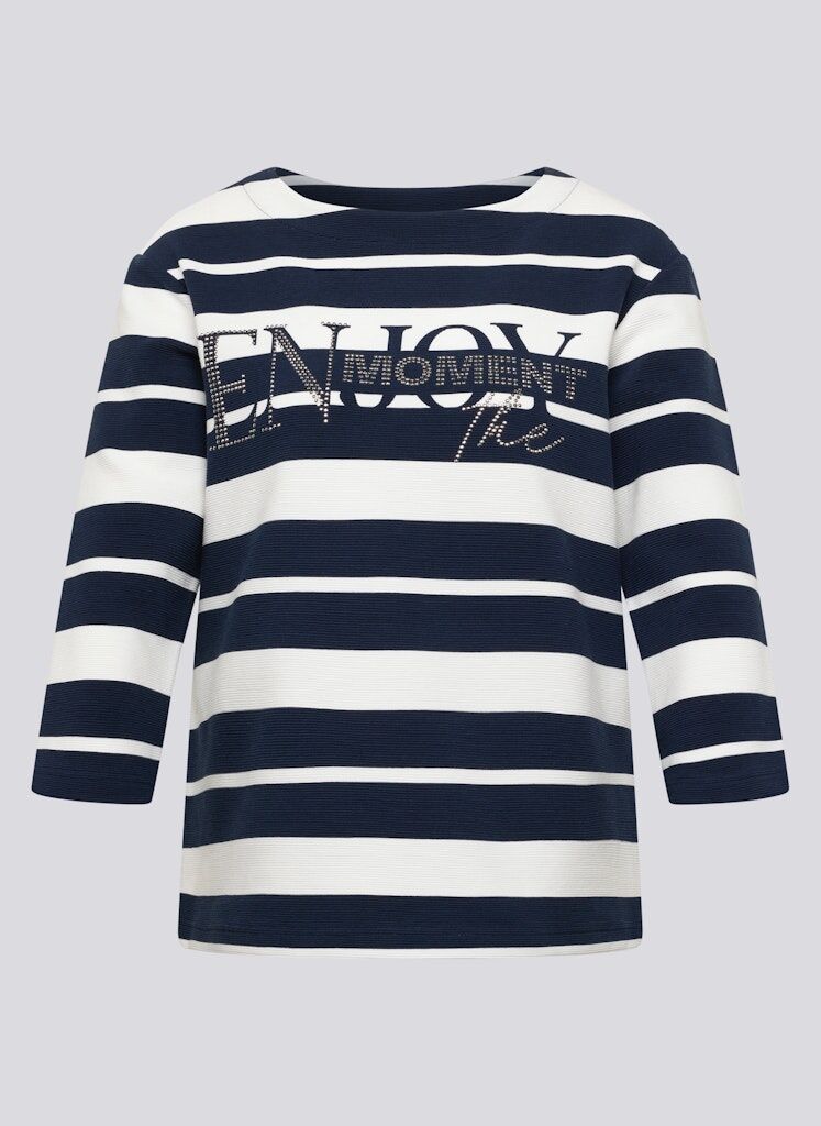 Dieses Ringelshirt mit 3/4-Arm kombiniert klassische Streifen mit einem modernen Schriftzugprint, der durch funkelnde Strasssteine veredelt wird. Die strukturierte Oberfläche sorgt für eine besondere Haptik, während der elastische Materialmix hohen Tragekomfort garantiert. Ein stilvoller Hingucker für gepflegte Casual-Looks.