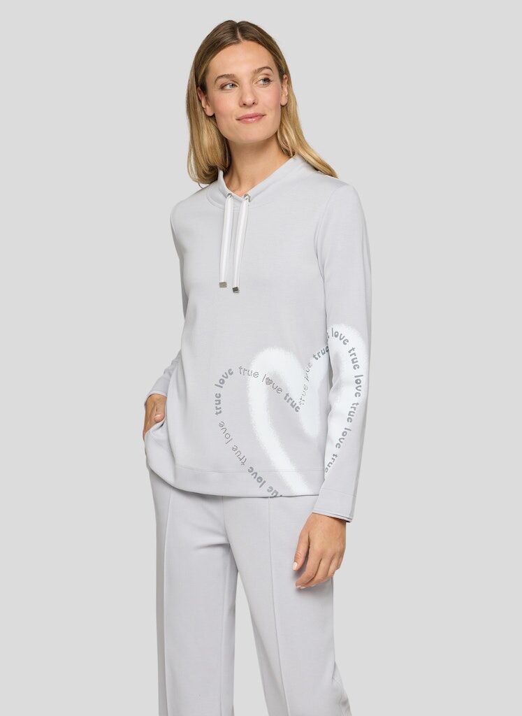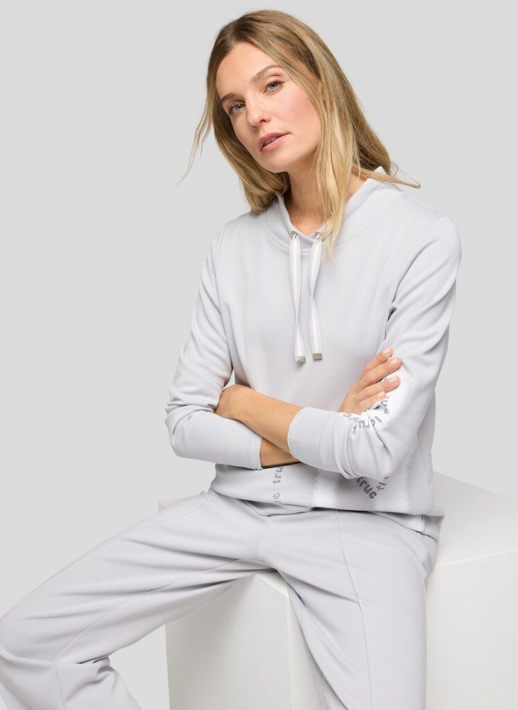 Dieser Hoodie präsentiert sich mit modernem Tunnelkragen und kontrastierenden Bindebändern. Der dekorative Schriftzug mit dezenten Strassdetails setzt einen modischen Akzent. Die hochwertige Materialmischung aus 48 % Polyester, 47 % Viskose und 5 % Elasthan sorgt für ein angenehm weiches Tragegefühl, fließenden Fall und bequeme Bewegungsfreiheit. Ideal für sportive Casual-Looks. Weiche Materialmischung. Mit Viskoseanteil. Elasthan für Komfort. Tunnelkragen mit Bindeband. Print mit Strassdetails.
