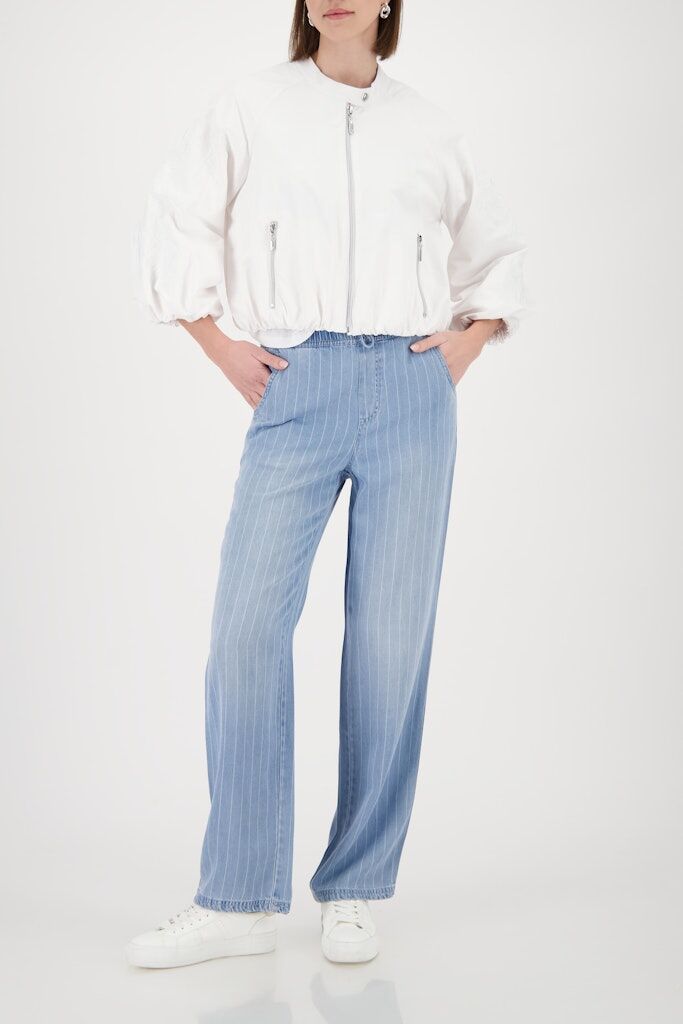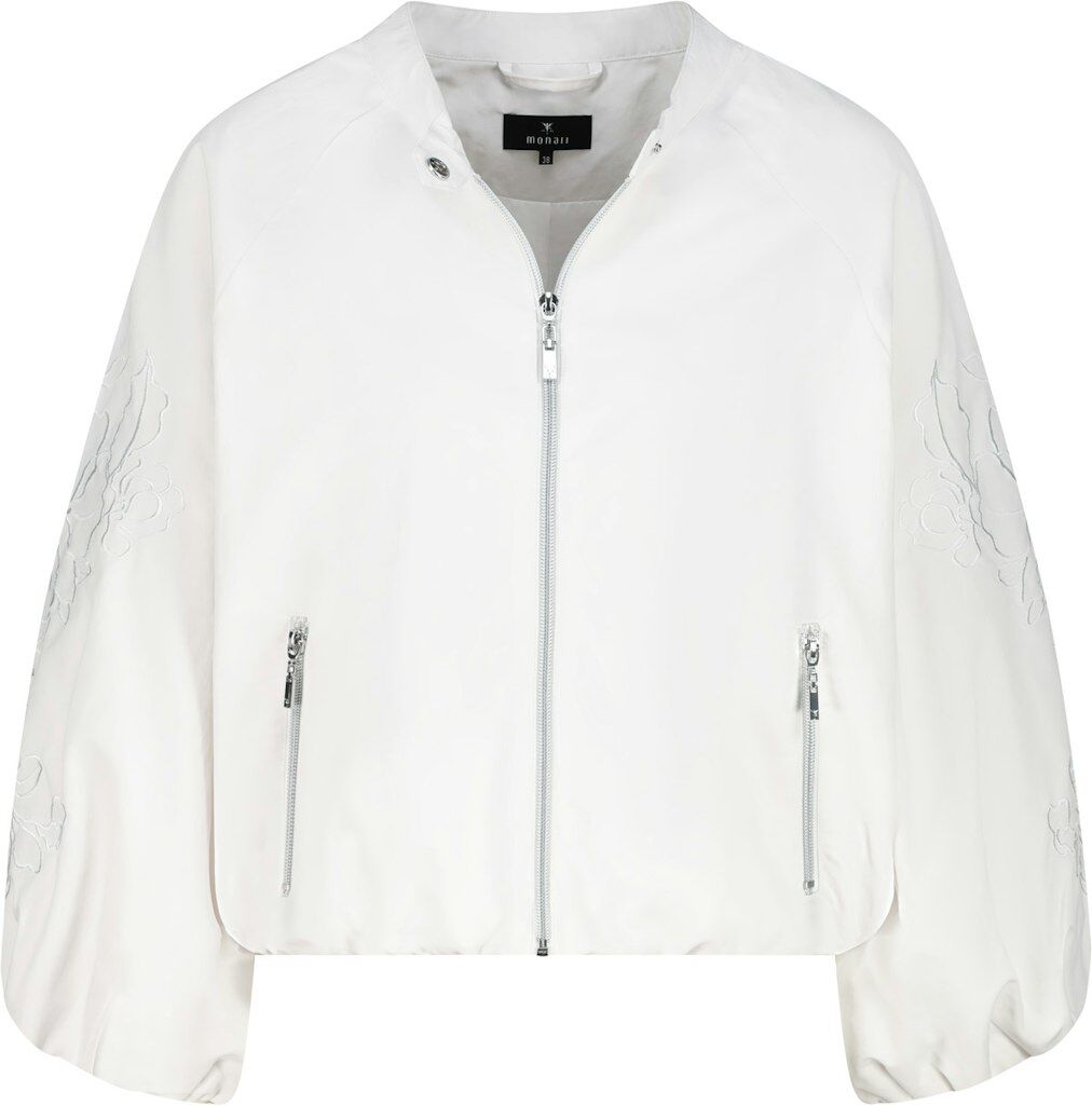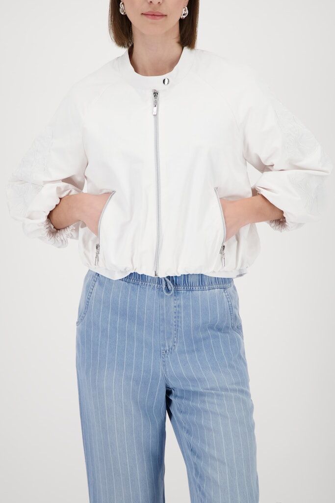 Moderne Nylon-Jacke mit eleganter Stickerei, ¾-Ärmeln und Reißverschlusstaschen. Stilvoller Rundhalsausschnitt mit praktischer Lasche und Druckknopf.
