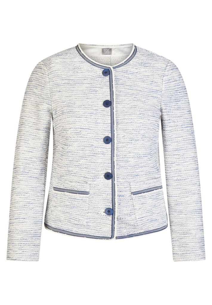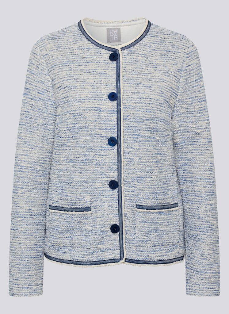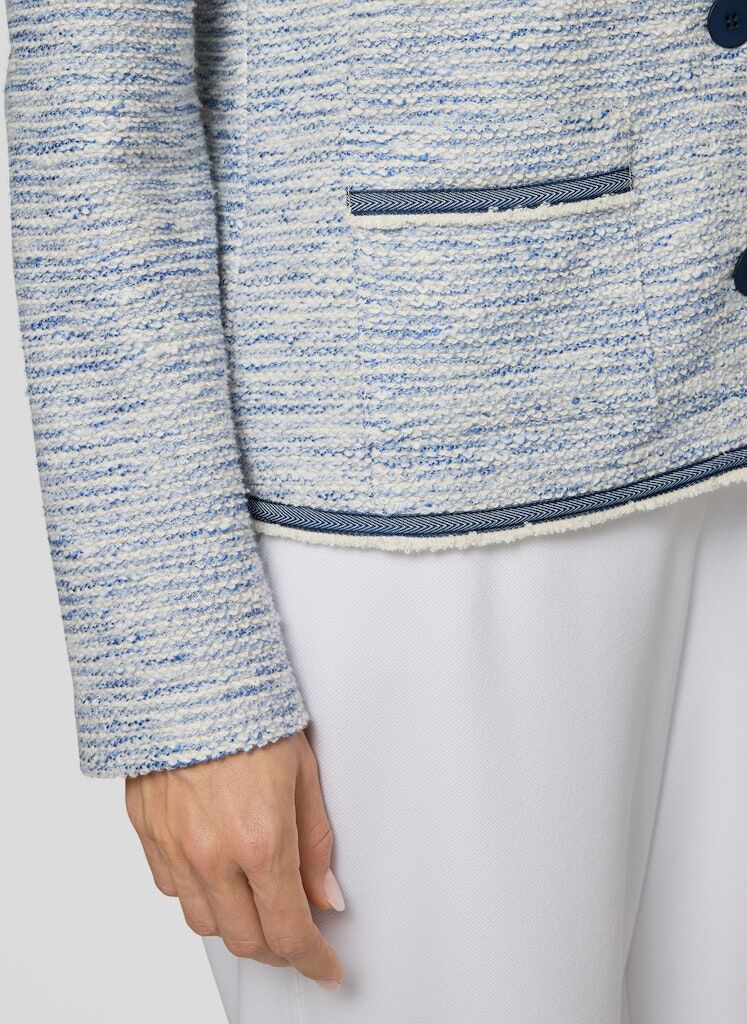Diese Jacke zeigt sich in einer fein strukturierten Qualität mit angenehm hohem Baumwollanteil und formstabilen Kunstfasern. Der Rundhalsausschnitt, die durchgehende Knopfleiste sowie die kontrastfarbigen Paspeln an Kanten und Taschen verleihen ihr eine gepflegte, moderne Ausstrahlung. Die aufgesetzten Taschen unterstreichen den klassischen Charakter, während das leichte Material für ein komfortables Tragegefühl sorgt _ ideal für Büro und Alltag. Strukturierte Qualität mit Baumwolle. Rundhalsausschnitt mit Knopfleiste. Kontrastpaspeln als Detail. Aufgesetzte Taschen vorn. Angenehm leicht zu tragen.