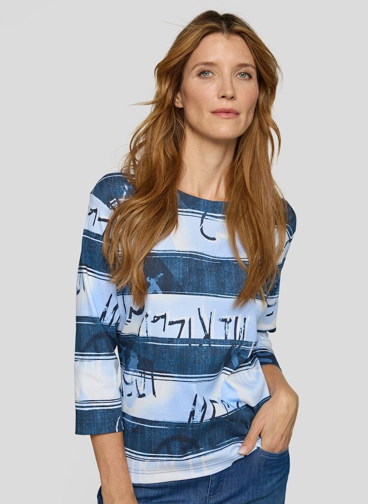 Dieses Shirt überzeugt mit einem modernen Allover-Print in Streifenoptik mit abstraktem Schriftzug. Der hochwertige Baumwolljersey trägt sich angenehm weich auf der Haut und sorgt für ein bequemes Tragegefühl. Der klassische Rundhalsausschnitt und die 3/4-Ärmel unterstreichen den legeren Charakter _ perfekt für entspannte Casual-Looks. Reine Baumwolle in Jersey-Qualität. 3/4-lange Ärmel. Rundhalsausschnitt. Locker geschnitten. Allover-Streifen mit Schriftzug.