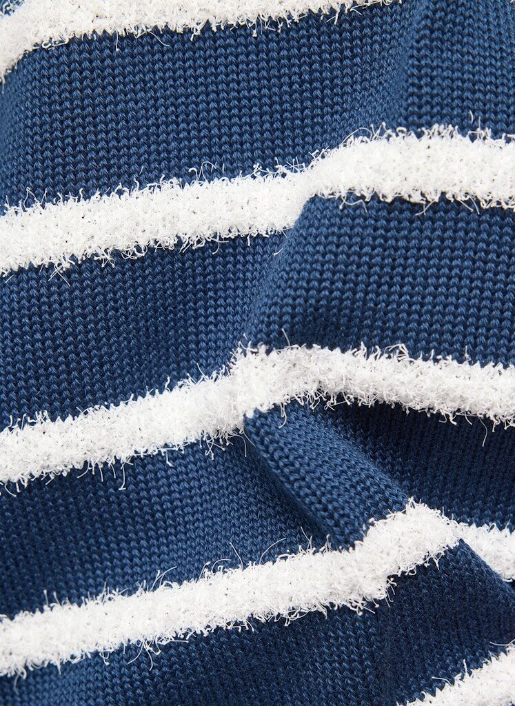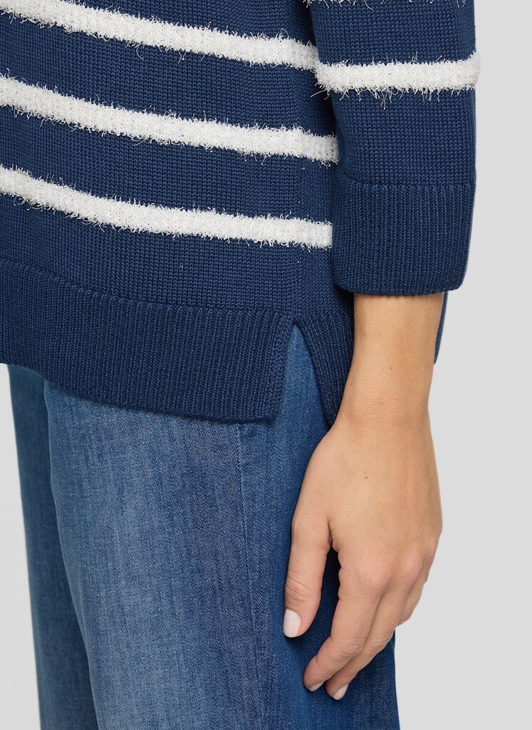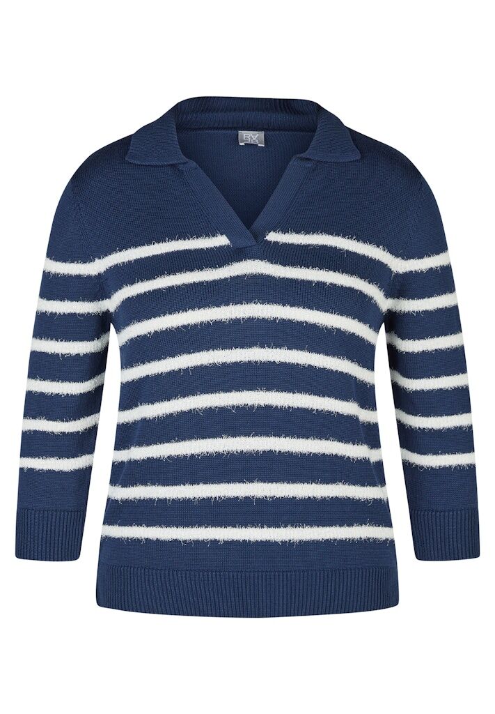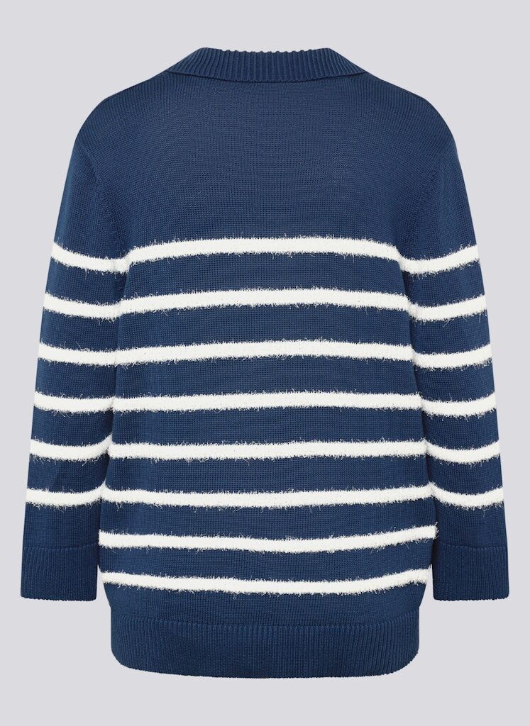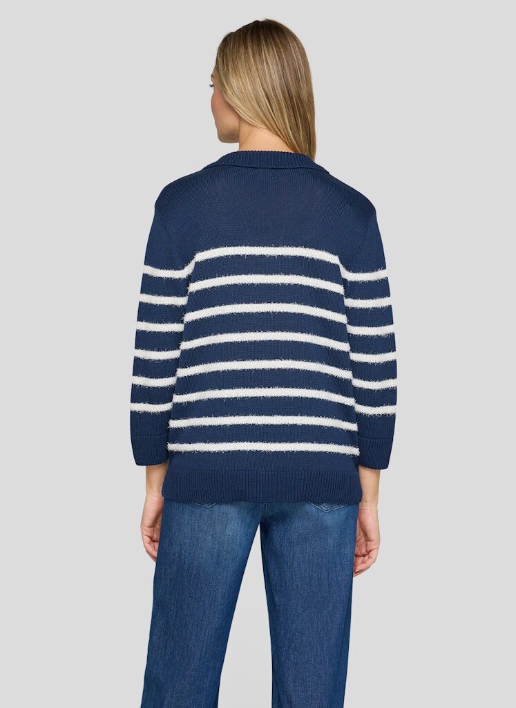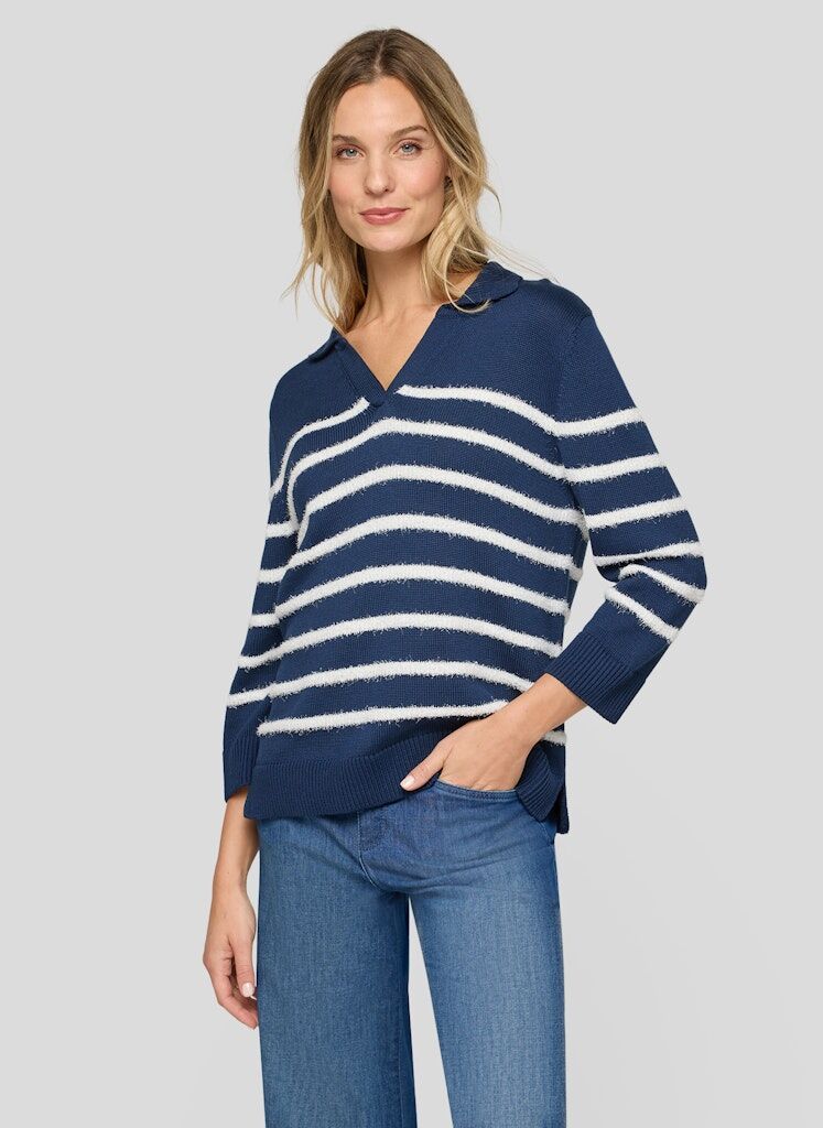 Dieser Pullover kombiniert einen modischen Look mit lässigem Tragekomfort. Der V-Ausschnitt mit angesetztem Polokragen verleiht dem Design eine sportive Note, während die quer verlaufenden, strukturierten Streifen dem Look Tiefe geben. Die Ärmel sind kürzer gehalten, die Seitenschlitze am Saum sorgen für eine angenehme Passform. Ideal für den Alltag und vielseitig kombinierbar. Weiche Strickqualität. V-Ausschnitt mit Kragen. Verkürzte Ärmel. Strukturierte Streifenoptik. Bequeme Seitenschlitze am Saum.