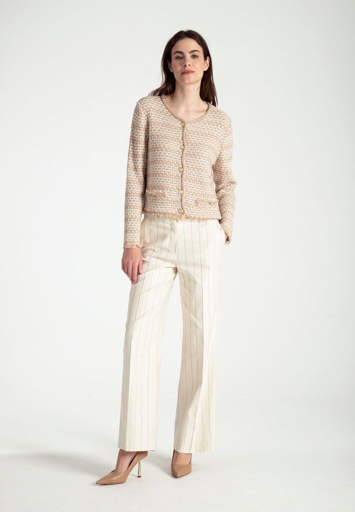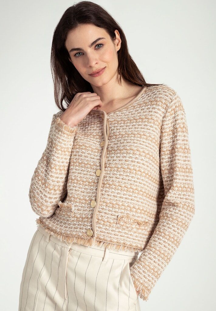 Den camel/beige gemusterten Cardigan von MORE & MORE mit goldfarbenen Knöpfen können Sie sehr vielseitig stylen, mal elegant mit Marlenehose und Heels, mal lässig mit verwaschener Jeans und Sneakers.