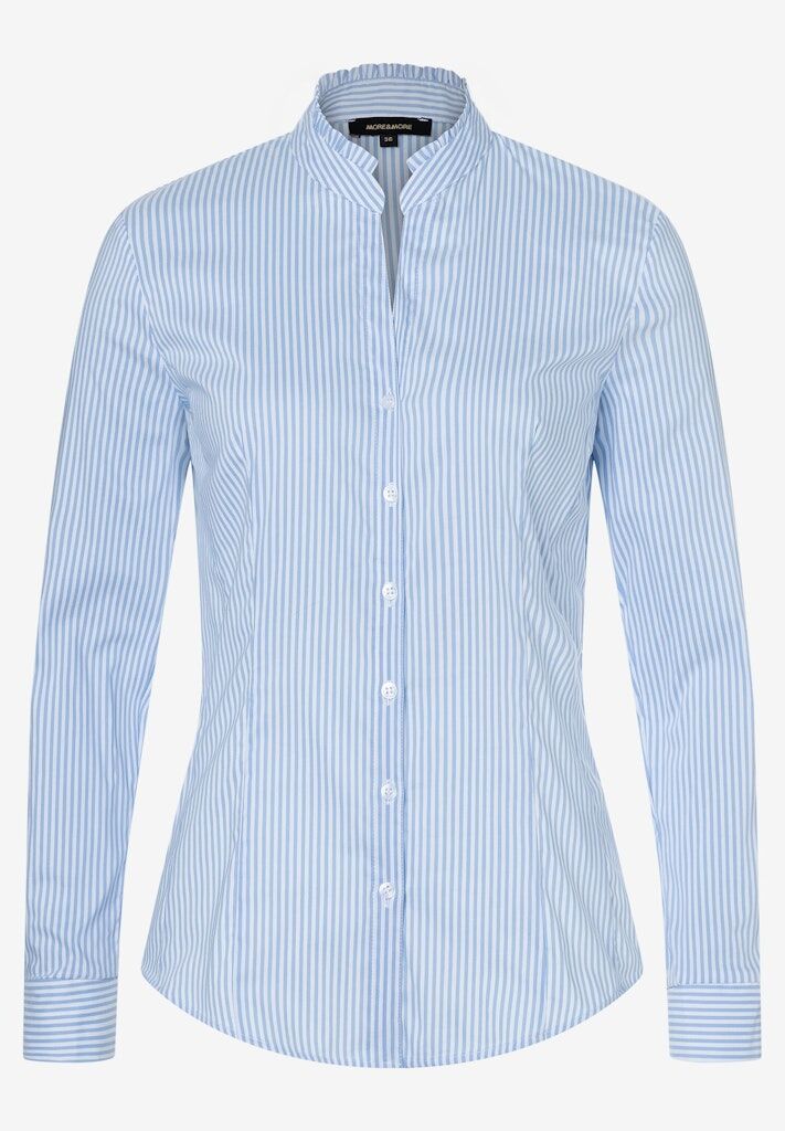 Die feminine Baumwoll/Stretch Bluse von MORE & MORE mit kleinem Stehkragen und Rüschenkante sieht unter Blazern, Cardigans und Pullovern gleichermaßen gut aus.