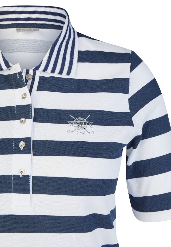 Die breiten Streifen verleihen dem Poloshirt eine klare, maritime Ausstrahlung. Ein klassischer Polokragen mit kurzer Knopfleiste unterstreicht den sportiven Charakter. Auf der Brust setzt ein kleines Strassmotiv einen dezenten, funkelnden Akzent. Die leicht taillierte Form sitzt bequem und wirkt zugleich feminin. Der elastische Baumwollmix sorgt für angenehmen Tragekomfort. Baumwollmix mit Stretch. Breites Streifenmuster. Polokragen mit Knopfleiste. Strassmotiv auf der Brust. Leicht taillierte Form.