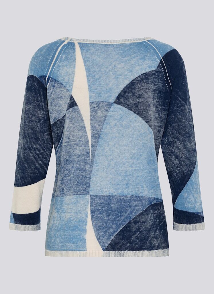 Dieser Pullover begeistert mit einem modernen grafischen Allover-Druck in verschiedenen Blautönen. Ziernähte an den Schultern setzen sportliche Akzente, während der funkelnde Schriftzug mit Strasssteinchen am Saum für ein stilvolles Highlight sorgt. Die weiche, elastische Qualität bietet hohen Tragekomfort und eine optimale Passform. Ideal kombinierbar zu Jeans oder einfarbigen Hosen.Grafischer Allover-Druck.Rundhalsausschnitt.Strass-Details am Saum.3/4-Ärmel.Angenehmes Stretch-Material.