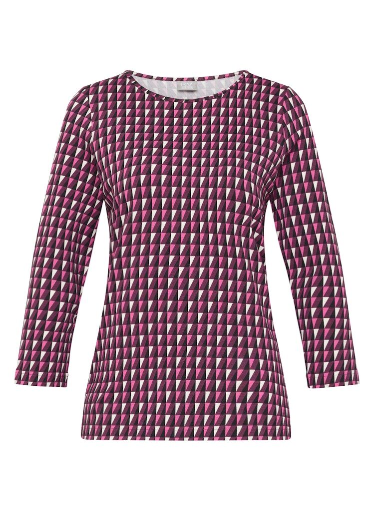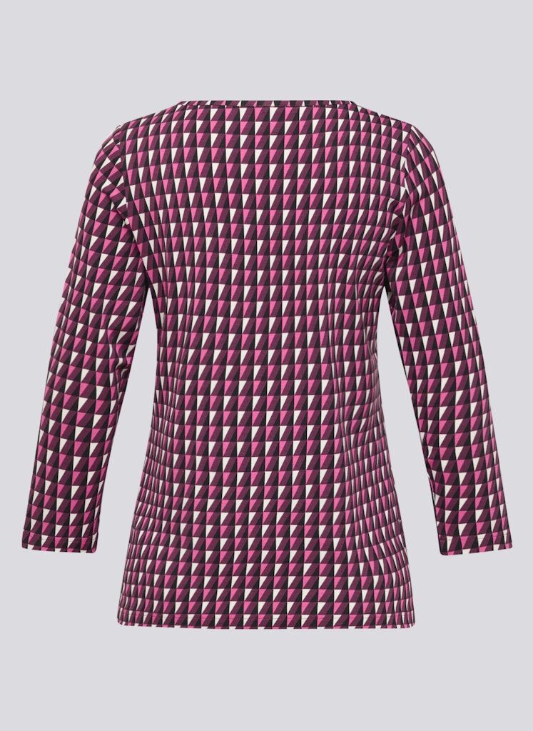 Das auffällige Allover-Muster in grafischer Optik verleiht diesem Shirt einen modernen Look. Die strukturierte Ware mit Stretch-Anteil sorgt für ein angenehmes Tragegefühl und einen formstabilen Sitz. Mit klassischem Rundhalsausschnitt und 3/4-langen Ärmeln eignet sich das Modell ideal für abwechslungsreiche Alltags-Outfits. Grafisches Allover-Muster. 3/4-lange Ärmel. Rundhalsausschnitt.