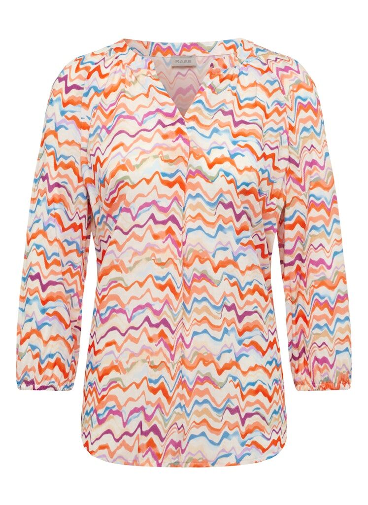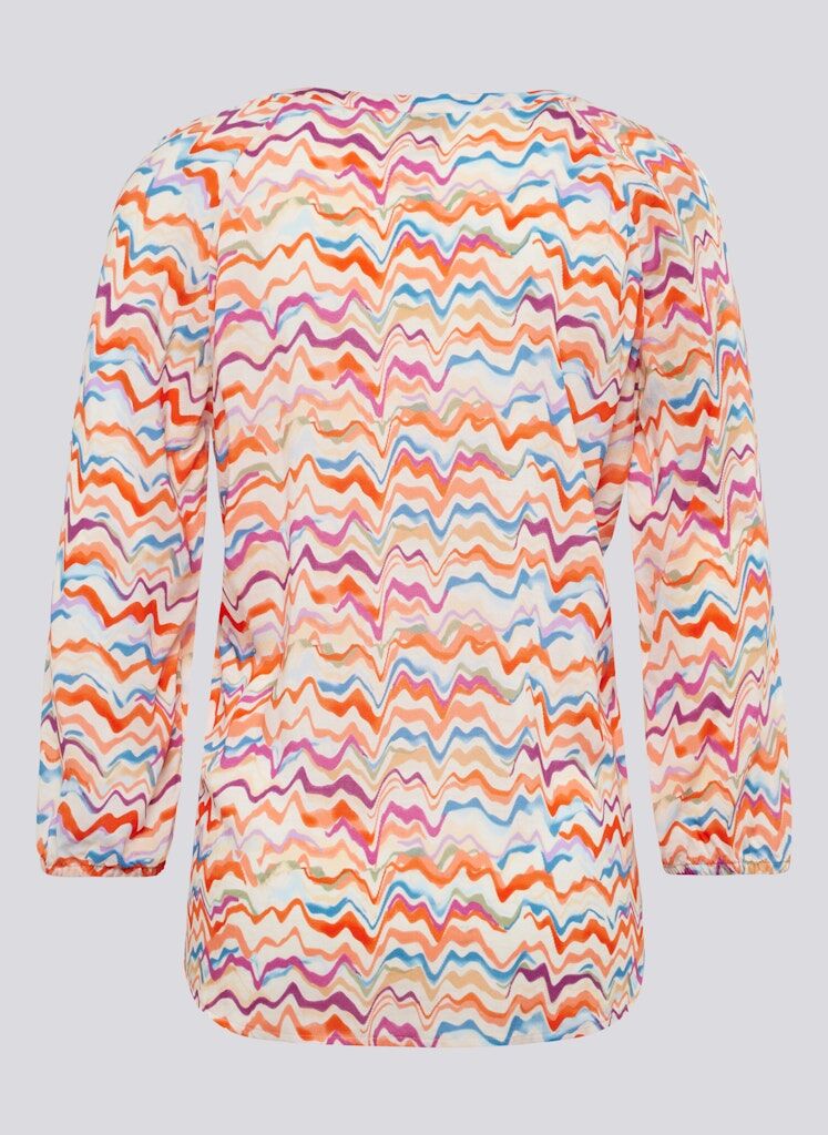 Die fließende Qualität sorgt für ein angenehmes Tragegefühl, während der feminine V-Ausschnitt und die 3/4-Ärmel mit elastischem Abschluss den Look charmant abrunden.Auffälliger Allover-Print mit Zickzack-Design.Weiche, leicht fließende Qualität.V-Ausschnitt für eine feminine Silhouette.3/4-Ärmel mit elastischem Bündchen.