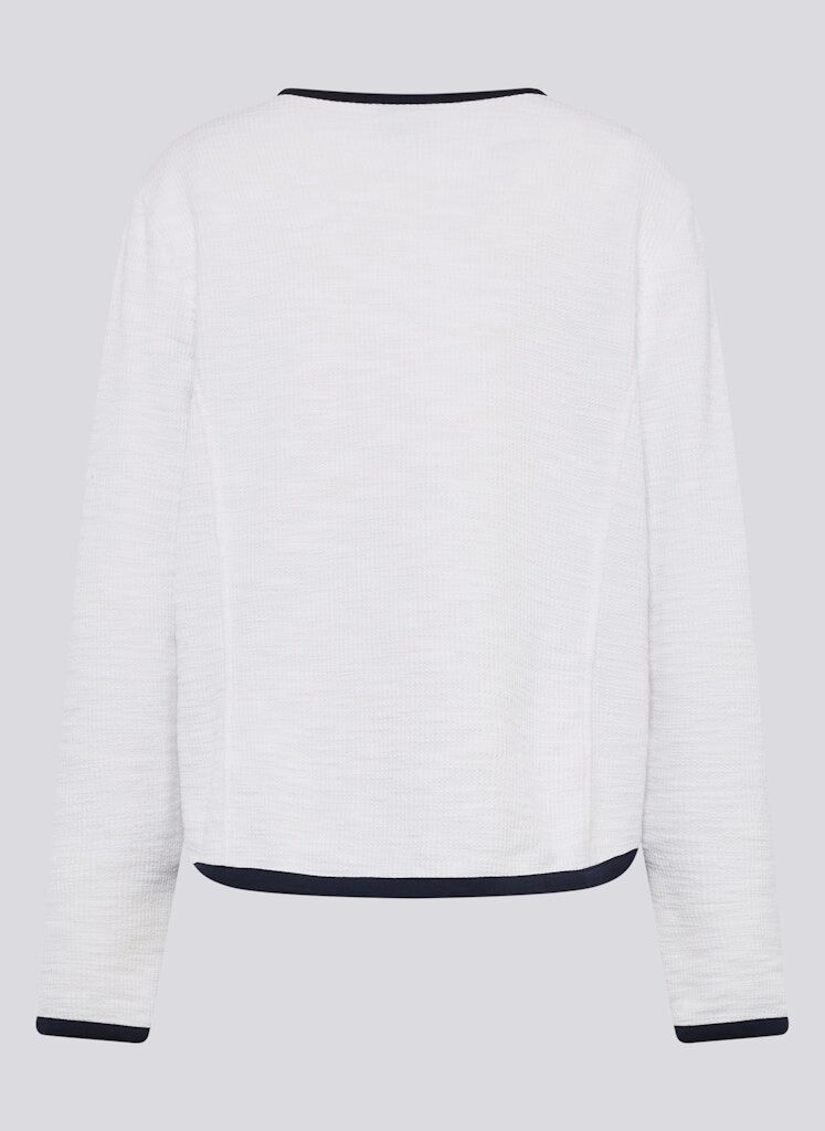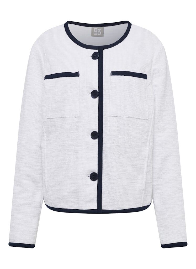 Diese Damen Jacke von RABE überzeugt durch ihre klare Linienführung und modische Kontraste. Der strukturierte Stoff wirkt hochwertig und leicht, während die dunklen Paspeln an Ausschnitt, Knopfleiste und Taschen stilvolle Akzente setzen. Ein vielseitiges It-Piece für gepflegte Outfits _ ob im Büro oder in der Freizeit.Strukturierter, leichter Stoff mit edler Haptik.Kontrastpaspeln als modisches Design-Detail.Klassischer Rundhalsausschnitt für eine feminine Silhouette.Praktische aufgesetzte Taschen mit dekorativem Akzent.Perfekt kombinierbar mit schlichten Oberteilen und schmalen Hosen.