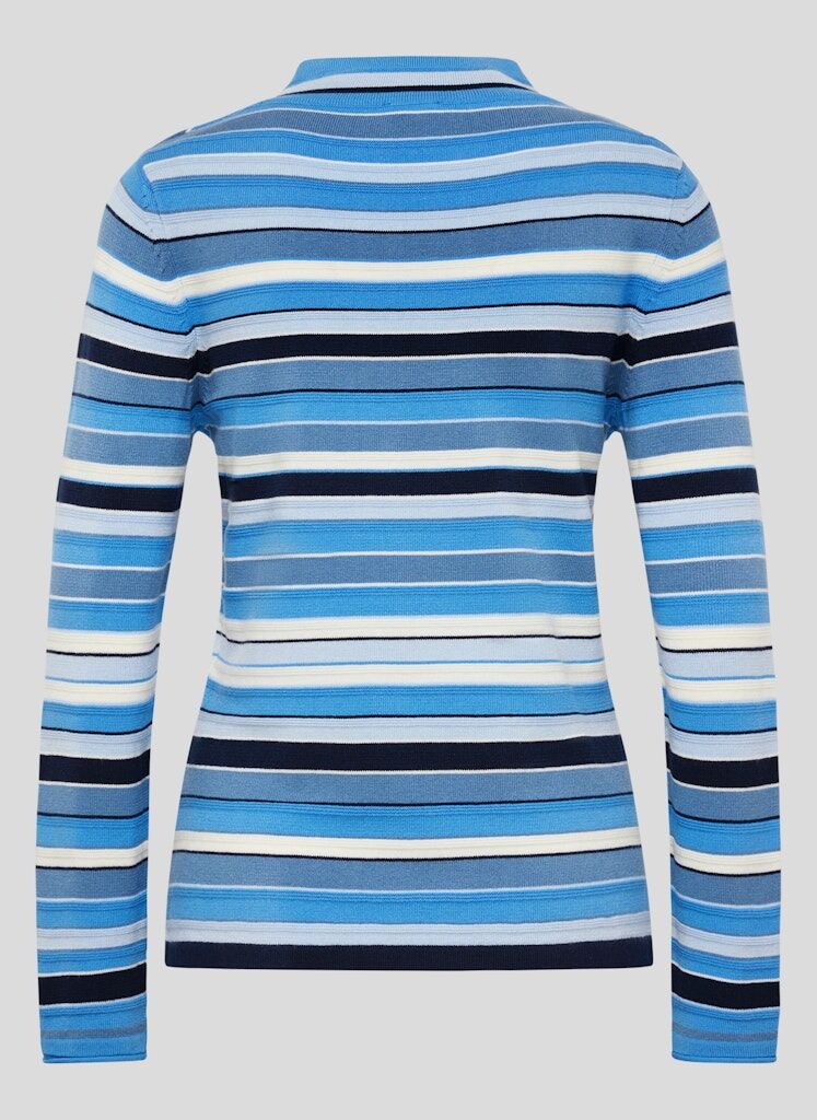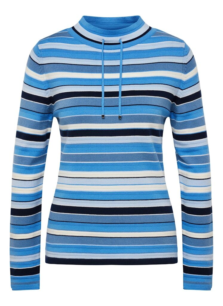 Der lockere Stehkragen mit Kordelzug verleiht dem Pullover eine sportliche Note. Die klassischen Ringel in verschiedenen Blautönen sorgen für einen zeitlosen, maritimen Look. Der weiche Strickstoff bietet ein angenehmes Tragegefühl und hält an kühleren Tagen wohlig warm. Ein vielseitiger Begleiter für entspannte Freizeitlooks _ stylisch und gemütlich zugleich!