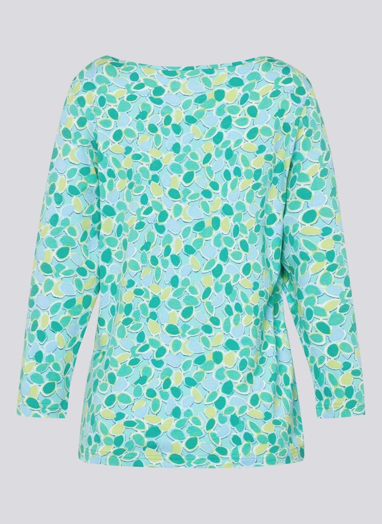 Dieses 3/4-Arm-Shirt begeistert mit einem dynamischen Allover-Print in frischen Grün- und Blautönen. Der weiche, elastische Stoff sorgt für optimalen Tragekomfort und eine perfekte Passform. Der klassische Rundhalsausschnitt verleiht dem Shirt eine feminine Note, während das leichte Material ideal für warme Tage und die Übergangszeit ist. Frischer Allover-Print - Lebhaftes Muster für einen sommerlichen Look. 3/4-Ärmel - Perfekt für die Übergangszeit. Vielseitig kombinierbar - Passt zu Jeans, Röcken und Stoffhosen.