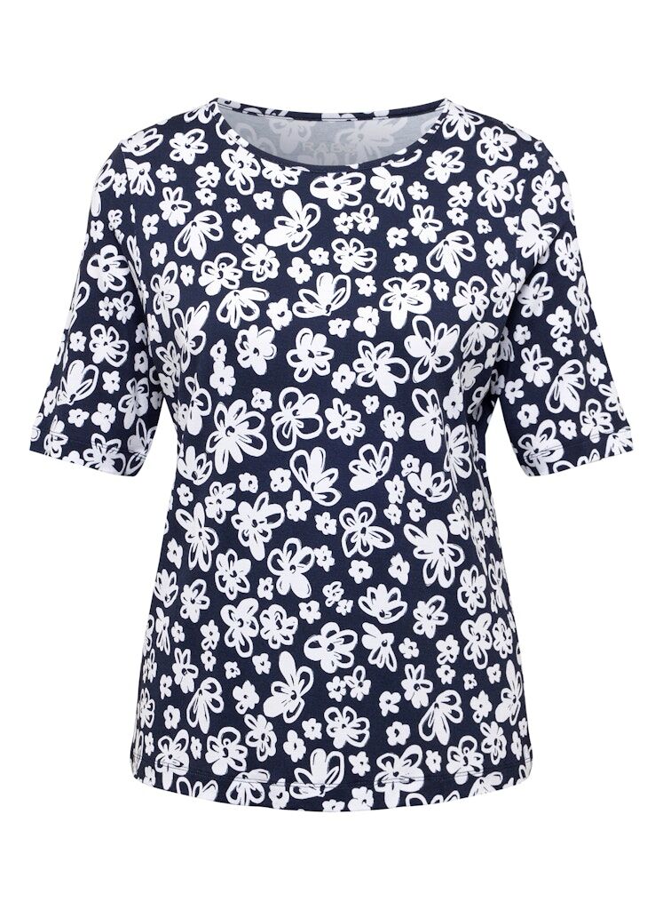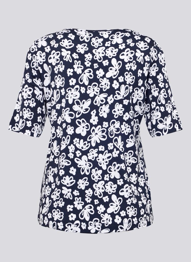 Das stilvolle Design in Marine und Weiß überzeugt durch seine moderne Leichtigkeit und feminine Ausstrahlung. Die halblangen Ärmel und der klassische Rundhalsausschnitt sorgen für angenehmen Tragekomfort _ perfekt für Büro, Freizeit oder Urlaub.Allover-Blumendruck in ausdrucksstarkem Design.Bequeme Halbarm-Länge & Rundhalsausschnitt.Weiche, pflegeleichte Qualität.Vielseitig kombinierbar _ zu Jeans, Röcken oder Stoffhosen.