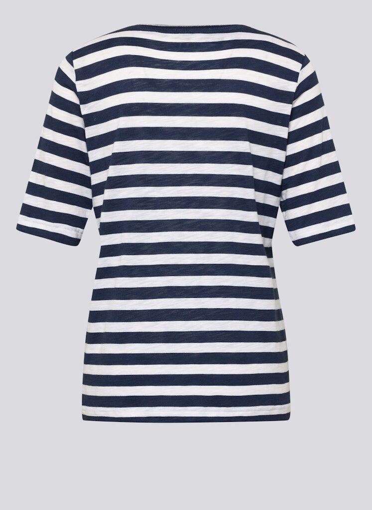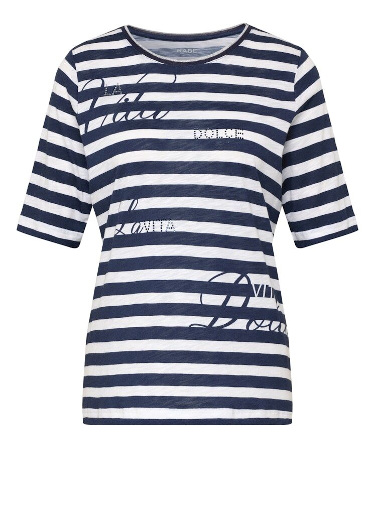 Dieses Shirt verleiht jedem Outfit eine frische Brise und mediterranen Charme. Das klassische Streifenmuster trifft auf verspielte Schriftzüge mit glitzernden Details _ ideal für feminine Freizeit-Looks mit Urlaubsfeeling.Zeitloses Streifendesign mit modischer Note._Dolce Vita_-Schriftzüge in verschiedenen Typografien.Glitzernde Akzente als funkelnder Hingucker.Rundhalsausschnitt und halblange Ärmel für bequemen Sitz.Weiche Jersey-Qualität mit hohem Tragekomfort.