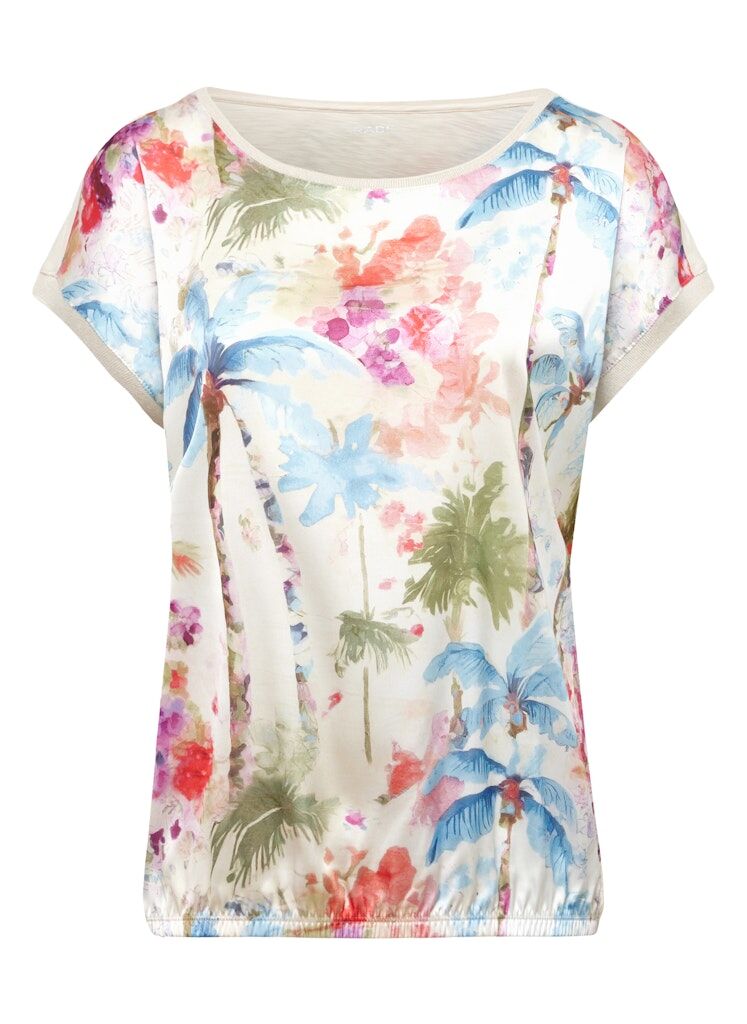 Der tropische Palmenprint in zarten Aquarelloptik bringt Farbe und Leichtigkeit in jedes Outfit. Die überschnittenen Ärmel und der angenehme Rundhalsausschnitt sorgen für einen entspannten Sitz und machen das Shirt zum idealen Begleiter an warmen Tagen.Auffälliger Allover-Print mit tropischem Motiv.Weiche Jerseyqualität mit fließendem Fall.Überschnittene Schultern für lässige Silhouette.Elastischer Saum für optimalen Sitz.Ideal kombinierbar zu Jeans, Shorts oder Röcken.