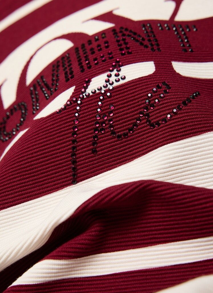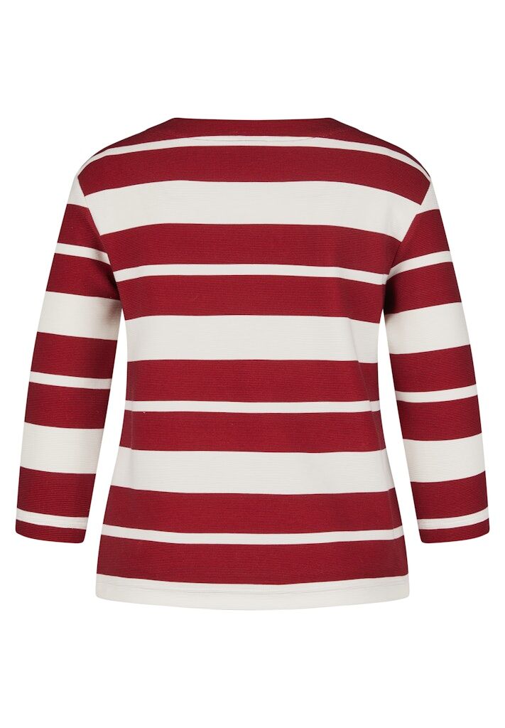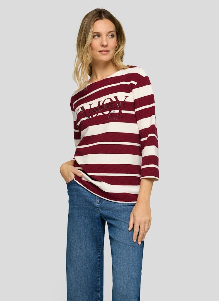 Dieses Ringelshirt mit 3/4-Arm kombiniert klassische Streifen mit einem modernen Schriftzugprint, der durch funkelnde Strasssteine veredelt wird. Die strukturierte Oberfläche sorgt für eine besondere Haptik, während der elastische Materialmix hohen Tragekomfort garantiert. Ein stilvoller Hingucker für gepflegte Casual-Looks. Strukturierte Jerseyware. Glitzernde Strasssteine vorn. Dekorativer Frontprint. 3/4-Ärmel mit bequemem Sitz. Klassischer Rundhalsausschnitt.