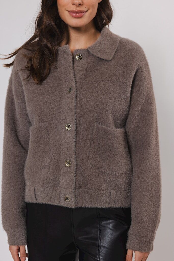 Ein modischer Leckerbissen für deinen Kleiderschrank ist garantiert die Rino & Pelle Strickjacke "Bubbly". Das gerade geschnittene Modell mit überschnittenen Schultern beeindruckt durch eine besonders flauschige Haptik. Farblich abgesetzte Knöpfe vorne, an den Ärmeln und an der Rückseite krönen das Design. Aufgesetzte Taschen und Rippbündchen an den Ärmeln und Saum sind weitere Hingucker. Die flauschige Boxy Jacket "Bubbly" von Rino & Pelle in der Farbe Taupe / Graubraun mit Unterlegekragen begeistert auf ganzer Linie! Jetzt schnell bestellen!