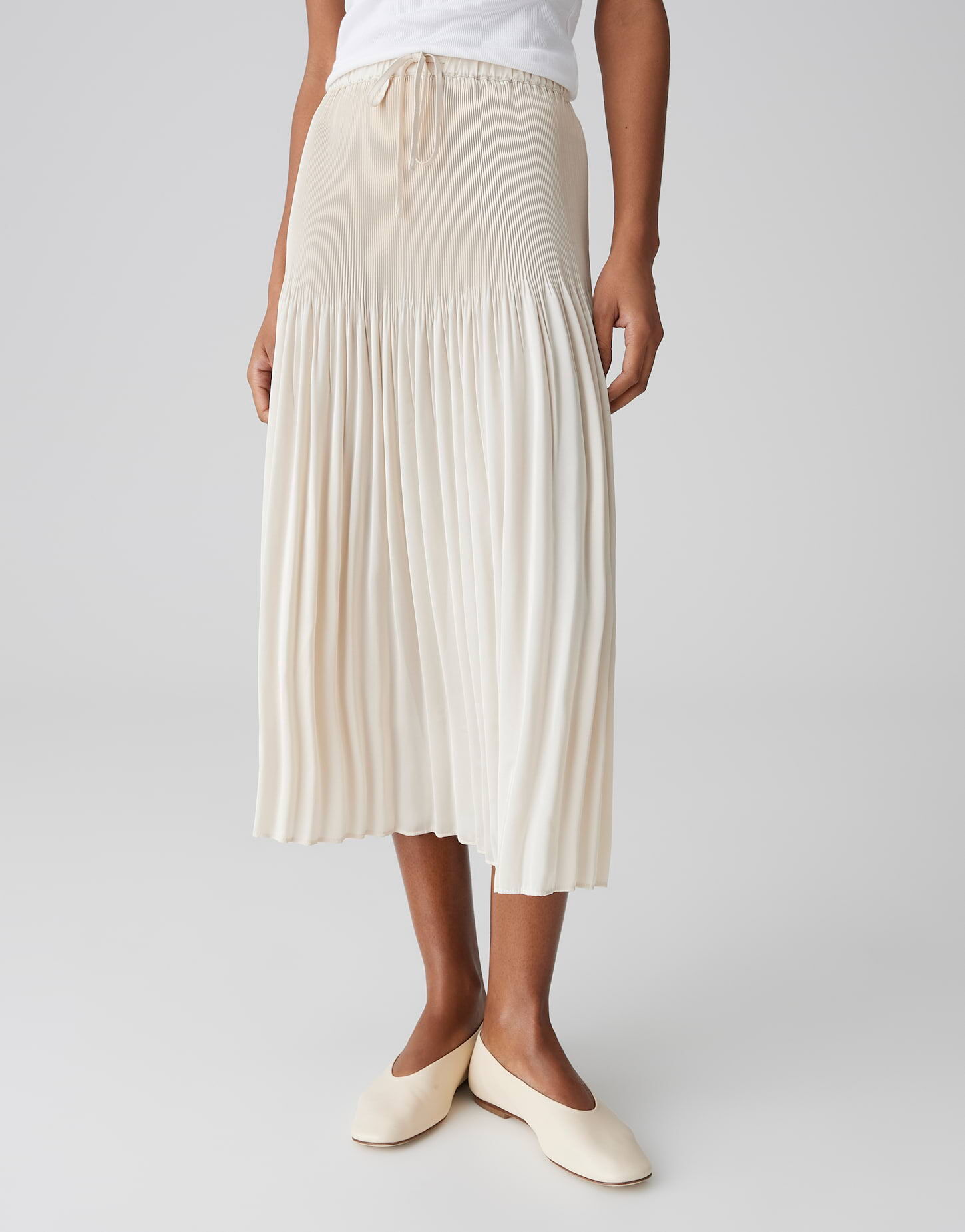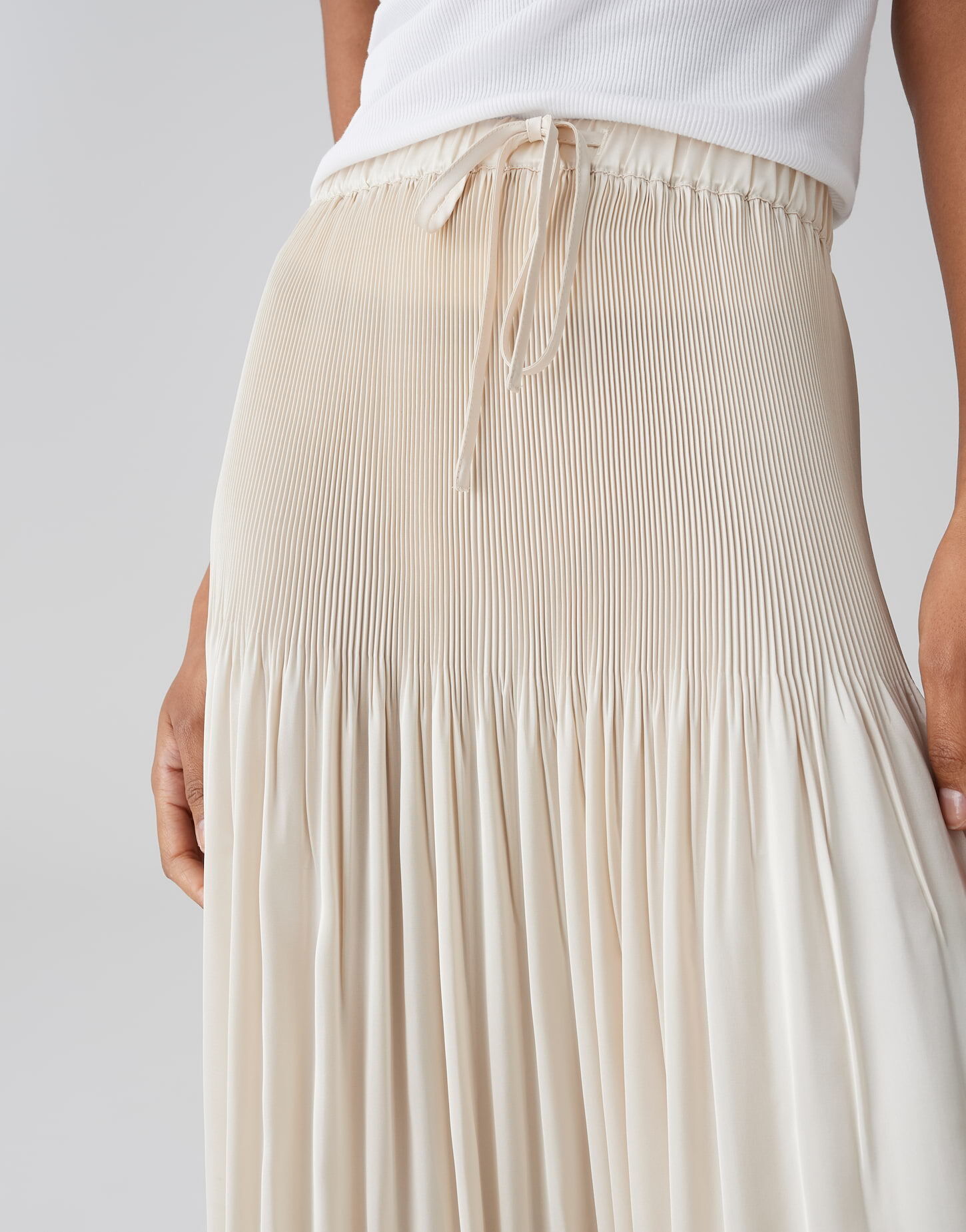 - Details: Elastischer Bund mit Tunnelzug und Bindeband, feine Faltenlegung, schwingender Saum