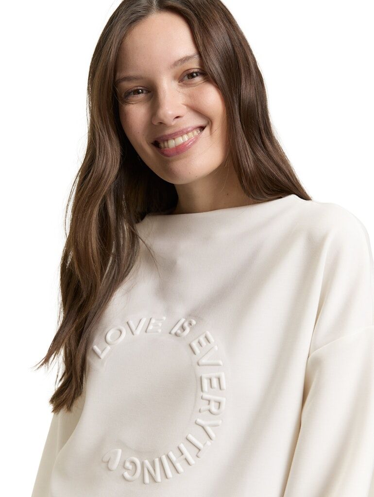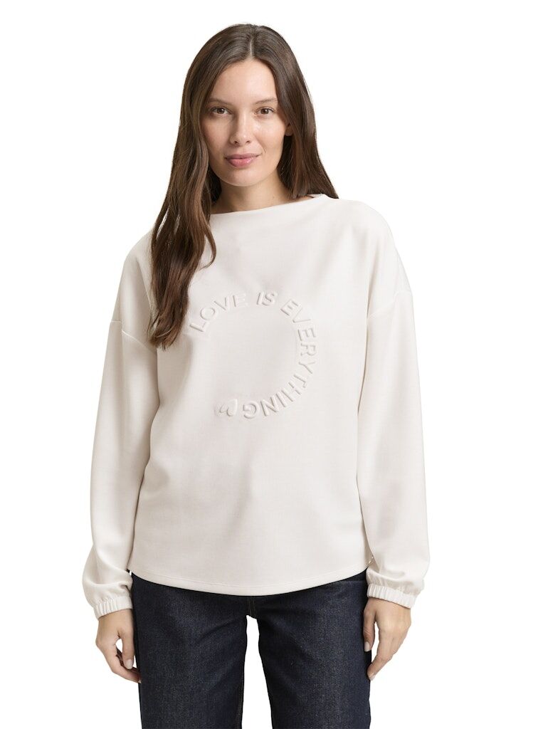 Longsleeve mit tonalem 3D-Textprint auf der Vorderseite. Mit elastischem Gummibund am Ärmelsaum und kurzen Seitenschlitzen. Aus einem weichen, knitterarmen und elastischen Scuba-Stoff.