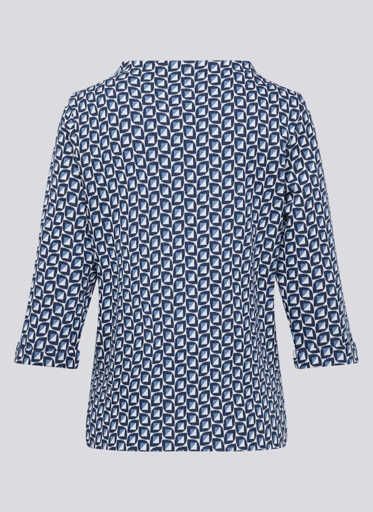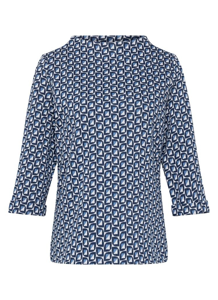 Dieses Shirt beeindruckt mit einem geometrischen Allover-Print, der für eine moderne und dynamische Optik sorgt. Der leicht angeschnittene Stehkragen verleiht dem Design eine besondere Note, während die ¾-Ärmel es vielseitig tragbar machen. Die elastische Qualität garantiert ein angenehmes Tragegefühl und eine optimale Passform.Weiche, elastische Qualität für hohen Komfort.Gerade, locker fallende Passform.Pflegeleichtes Material.Ein echter Hingucker für modische Alltagsoutfits.