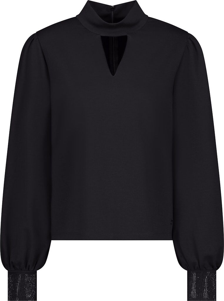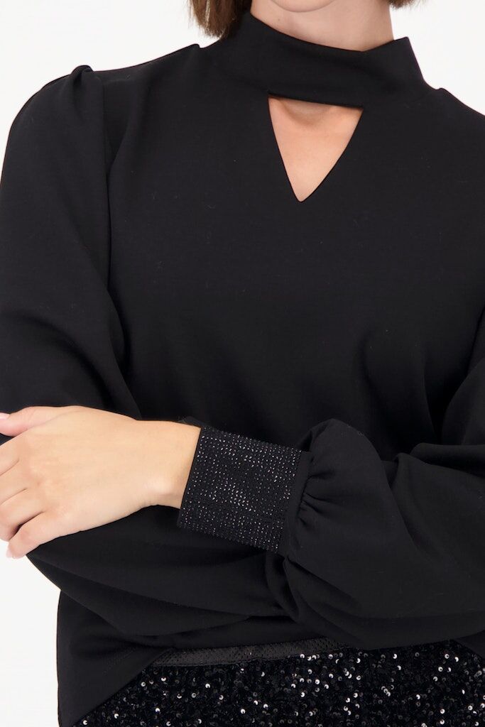 Dieses Sweatshirt besticht durch seinen stilvollen Cut-out unter dem Stehkragen sowie durch breite Ärmelbündchen mit tonigem Strass und Kräuselung.