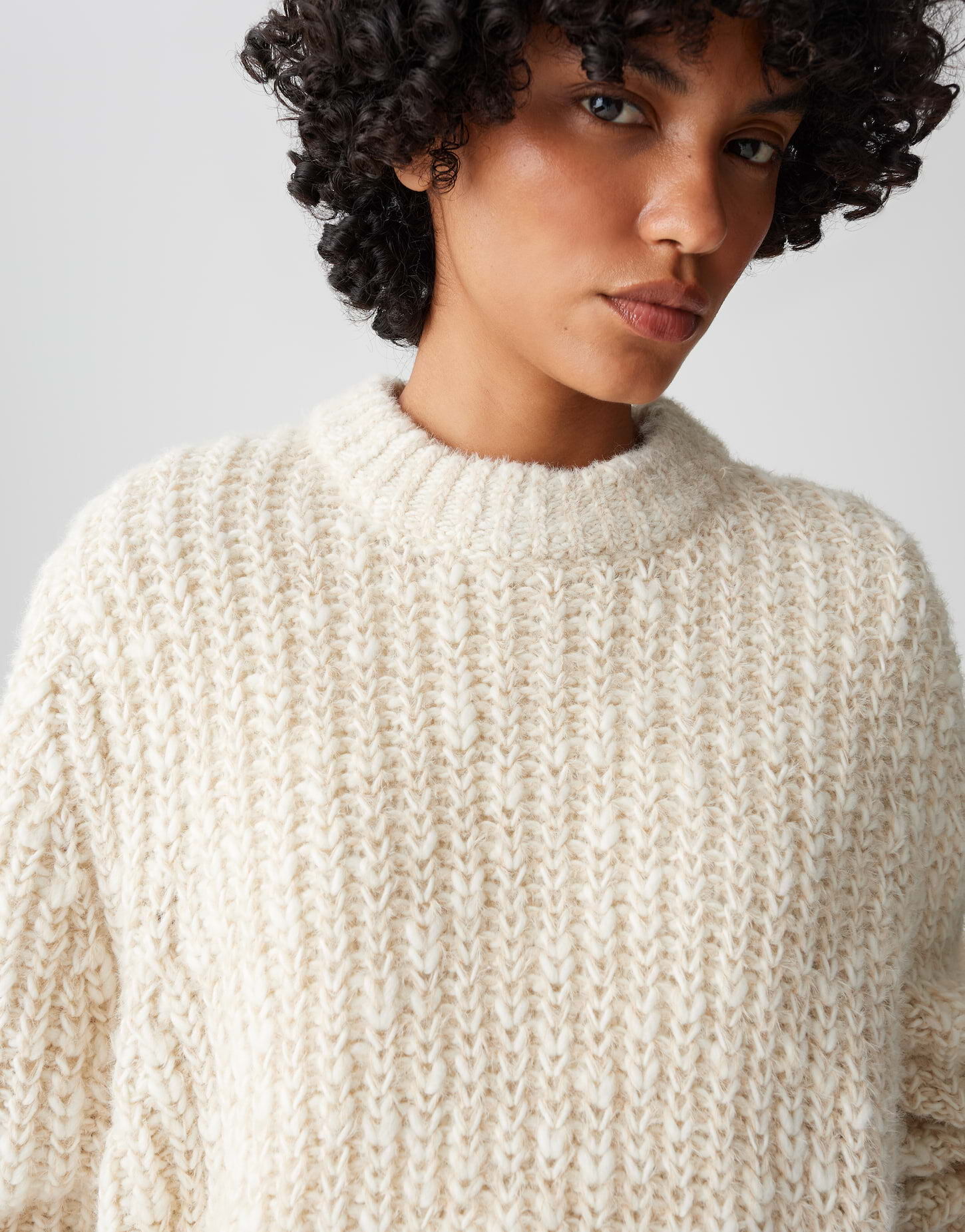 - Details: Breite Rippbündchen an Saum und Ärmeln, verkürzte Länge, strukturierter Garnmix