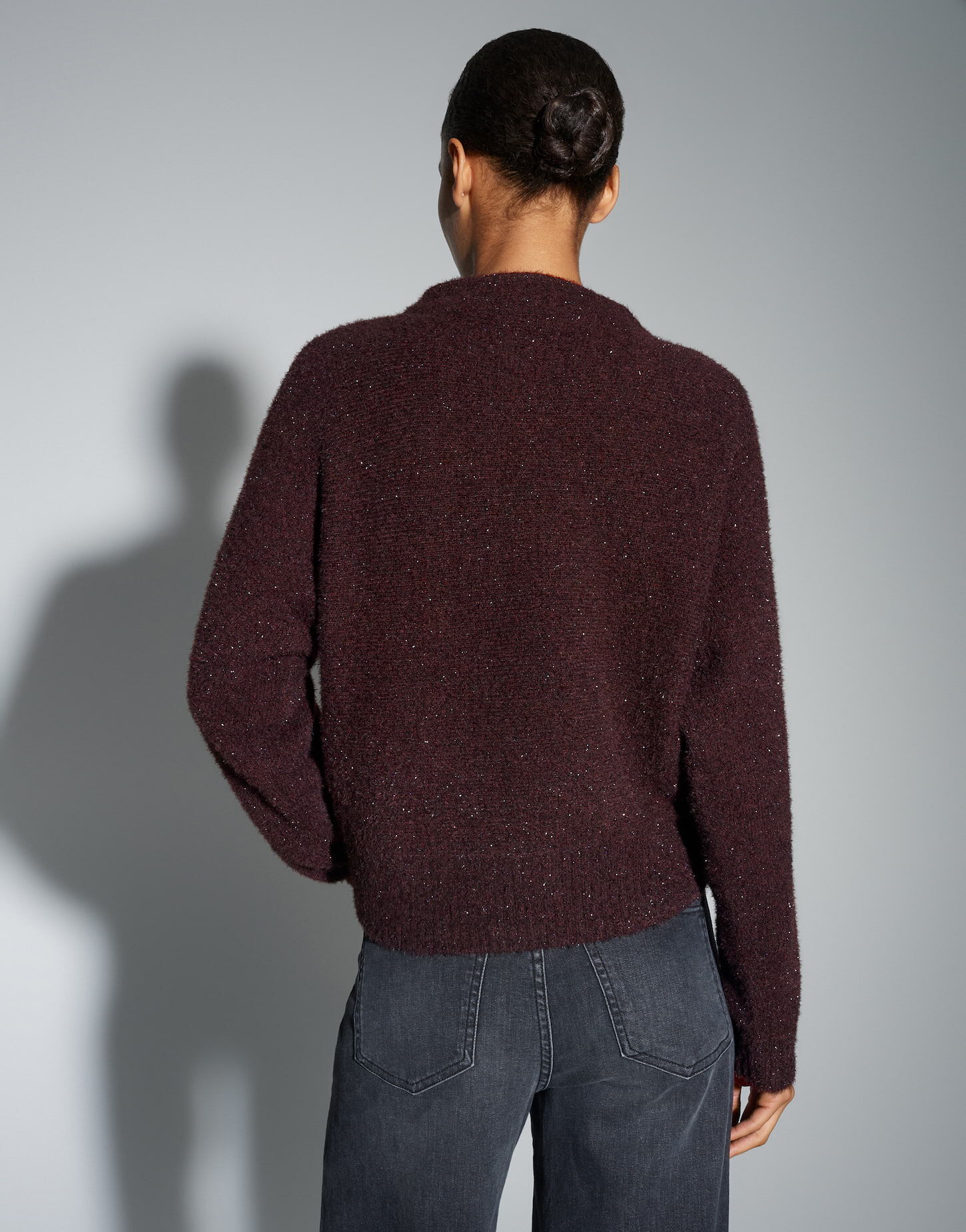 Der Strickpullover Posmic von Opus vereint Wohlfühlkomfort mit dezentem Glamour. Sein flauschiges Effektgarn mit feinem Schimmer verleiht dem Pullover eine edle Optik, während der extrem weiche Griff und das elastische, wärmende Material für maximalen Tragekomfort sorgen. In tiefem Bordeaux ist er ein stilvoller Begleiter für kalte Tage - ideal für gemütliche Alltagslooks mit einem Hauch Eleganz.