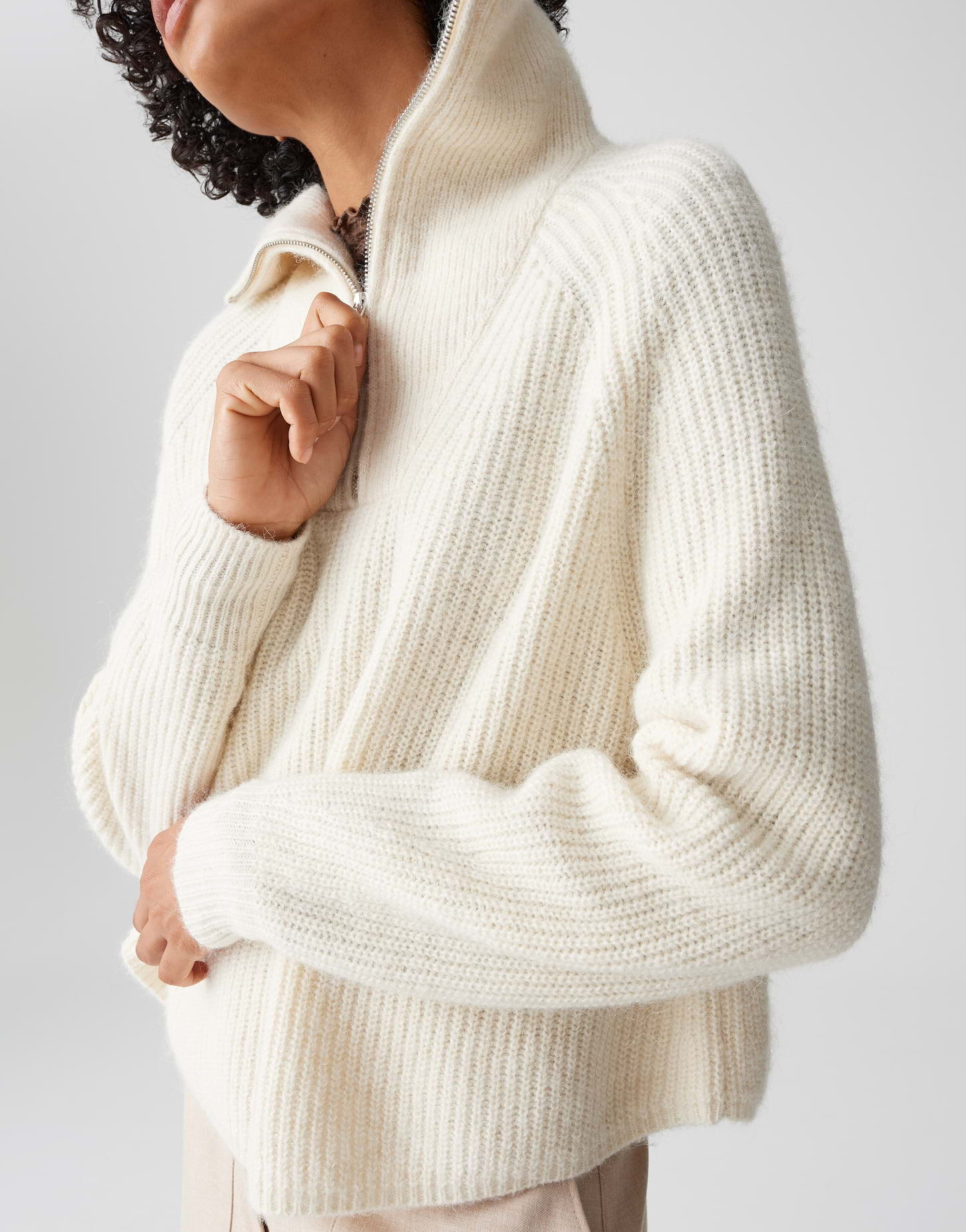 Der Strickpullover "Poy" von Opus überzeugt mit seinem zeitlosen Design und einem modernen Twist: Der halbe Zipper mit breitem Kragen sorgt für einen sportlich-eleganten Look und lässt sich je nach Styling individuell tragen. Die hochwertige, gerippte Strickstruktur in zartem Creme macht den Pullover zu einem gemütlichen Allrounder für die kühlen Tage - perfekt zu Jeans, Stoffhosen oder Röcken.