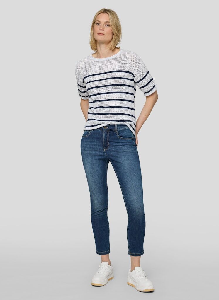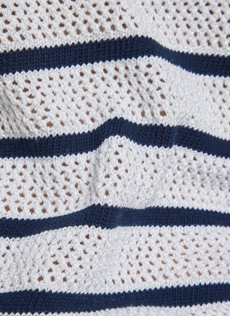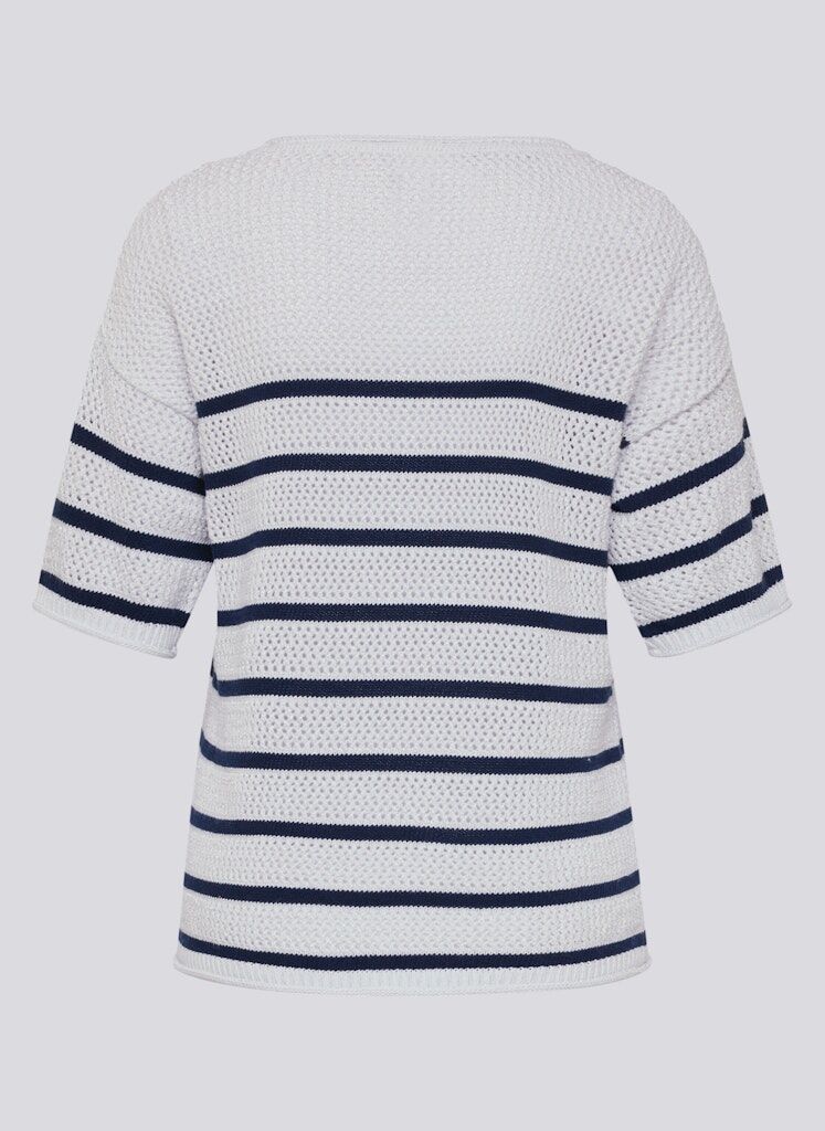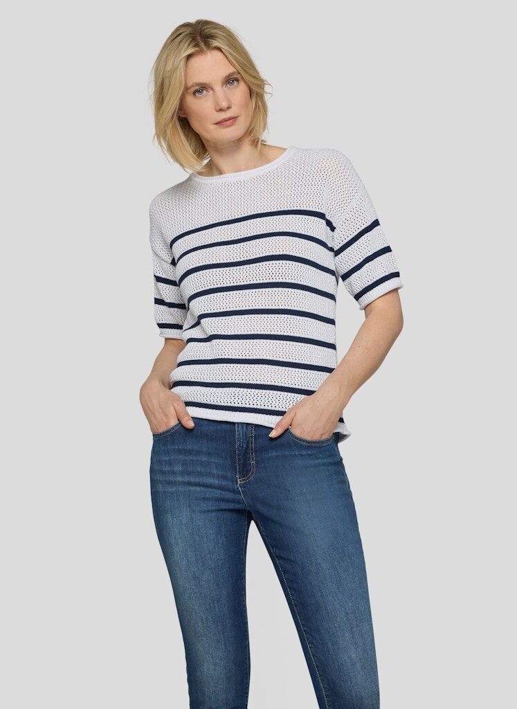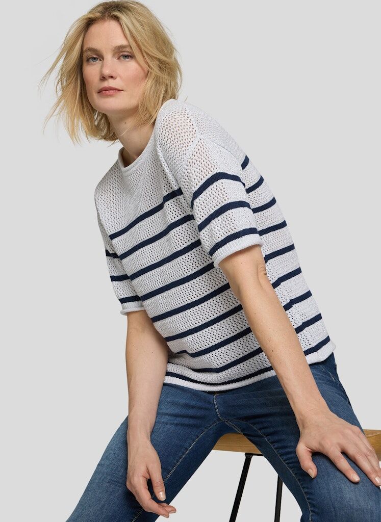 Die offene Lochstruktur verleiht diesem Strickshirt eine leichte, sommerliche Ausstrahlung. Das klassische Streifenmuster unterstreicht den maritimen Charakter und sorgt für eine klare, moderne Optik. Der Rundhalsausschnitt und die kurzen Ärmel machen das Modell vielseitig kombinierbar. Ein feiner Metallfaden im Material setzt dezente, schimmernde Akzente. Baumwollmix mit Metallfaden. Luftige Lochstruktur. Maritimes Streifenmuster. Rundhalsausschnitt. Halbarm.