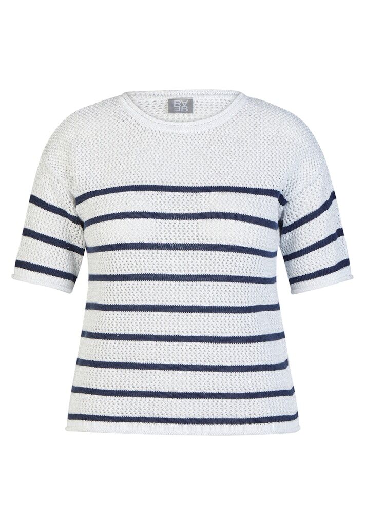 Die offene Lochstruktur verleiht diesem Strickshirt eine leichte, sommerliche Ausstrahlung. Das klassische Streifenmuster unterstreicht den maritimen Charakter und sorgt für eine klare, moderne Optik. Der Rundhalsausschnitt und die kurzen Ärmel machen das Modell vielseitig kombinierbar. Ein feiner Metallfaden im Material setzt dezente, schimmernde Akzente. Baumwollmix mit Metallfaden. Luftige Lochstruktur. Maritimes Streifenmuster. Rundhalsausschnitt. Halbarm.