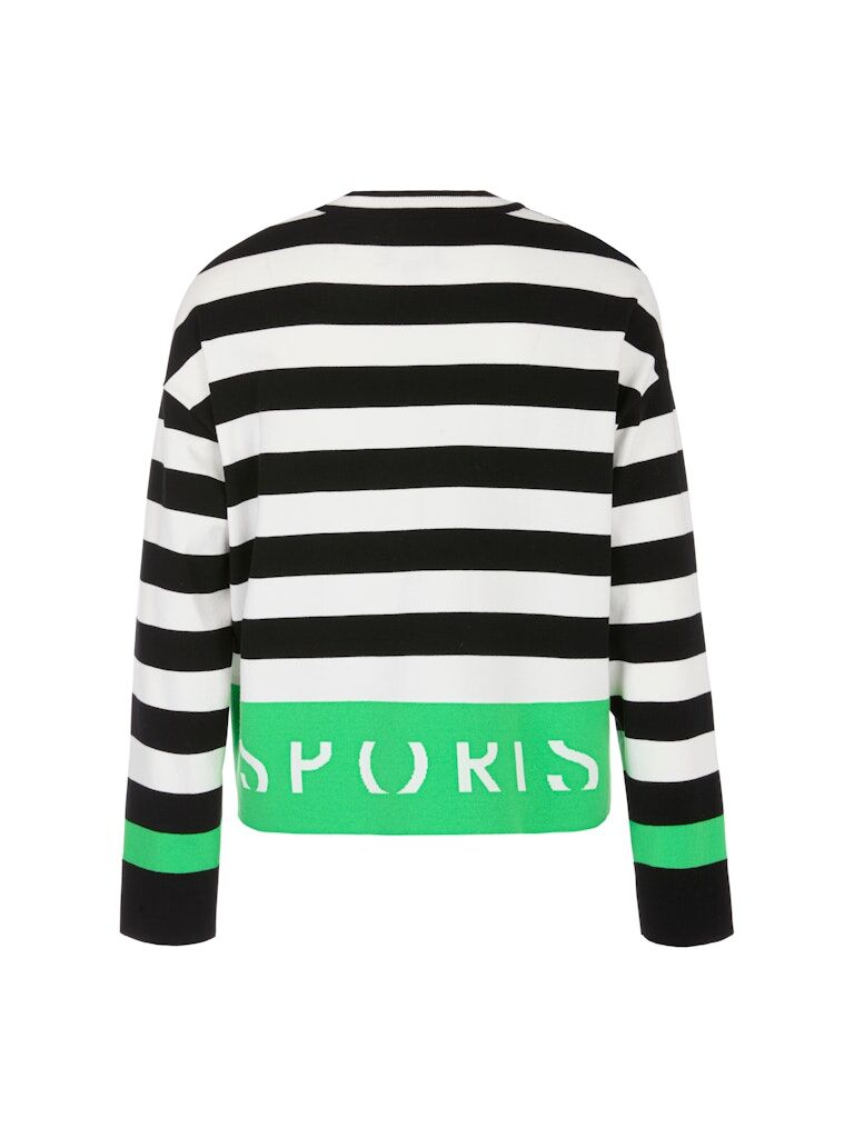 Sweater in Mustermix Knitted in Germany|Strickpullover in Mustermix. Das Modell ist im Rücken gestreift und trägt in der Front ein Leofell-Muster. Die Form ist oversized und das Material weichfließend. Der Pulli wird mit modernsten Technologien in Deutschland gestrickt und veredelt. Die einzelnen Teile - wie Rücken- und Vorderteil etc. - werden in europäischen Partnerbetrieben zusammengenäht.|Oversized|Knitted in Germany|Rundhals|Mustermix|Das Model ist 179 cm groß und trägt N3/38.